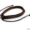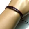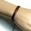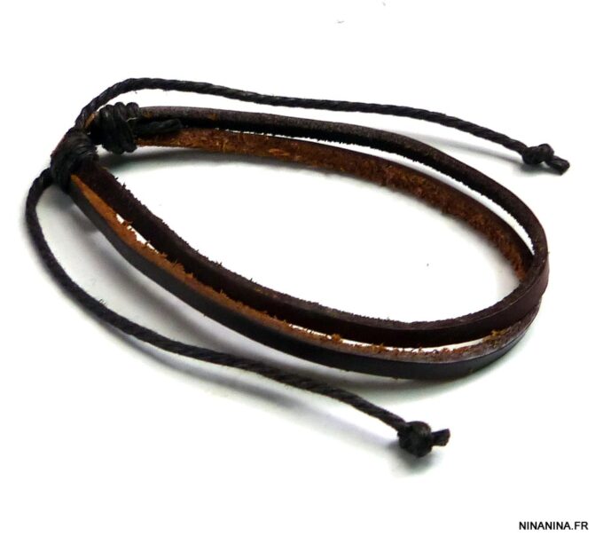 Bracelet cuir mixte composé de 2 lanières de cuir marron chocolat (3 mm de large) fermés par un cordon de coton ciré. Largeur : 0,6 cm. Diamètre : de 6 à 8 cm ajustable. Fermeture par noeud coulissant. Livré dans sa pochette d’organza