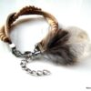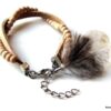 Bracelet cuir et plumes composé d’une rangée de perles de bois rondes, d’un lacet de cuir naturel et de deux plumes blanches et marron. Largeur du lacet : 0,5 cm environ. Longueur totale : 20 cm env. Fermoir mousqueton et chainette de rallongement. Livré dans sa pochette d’organza.