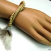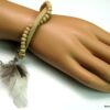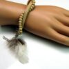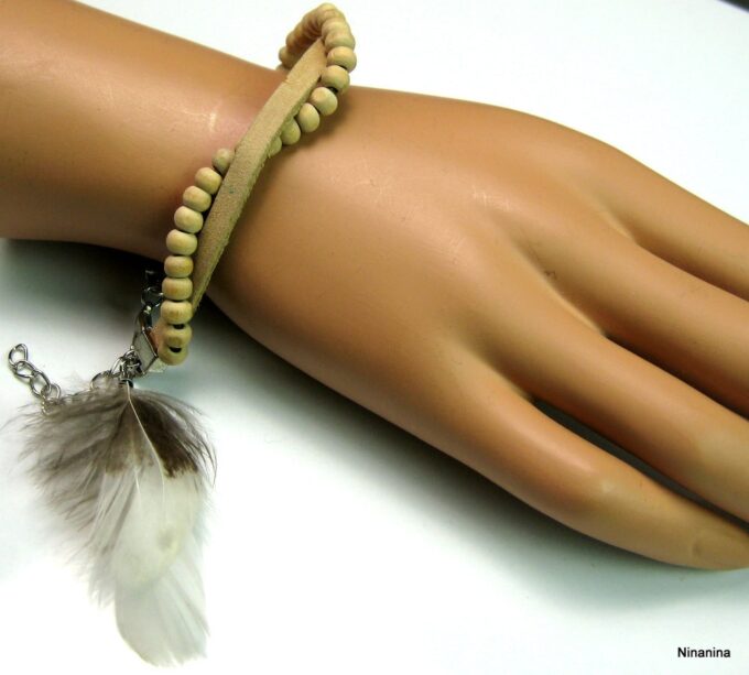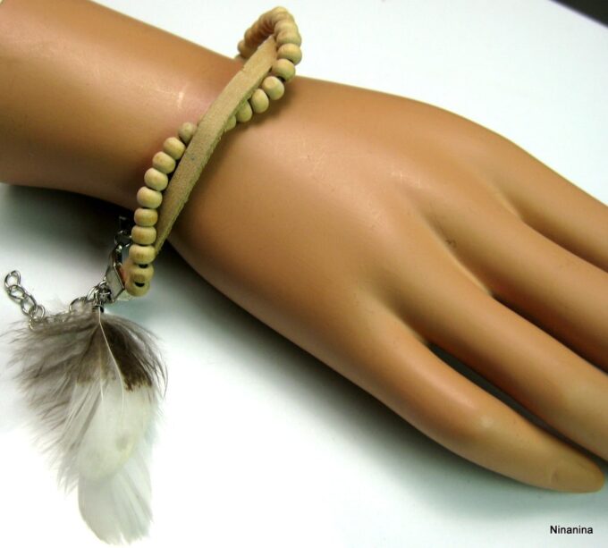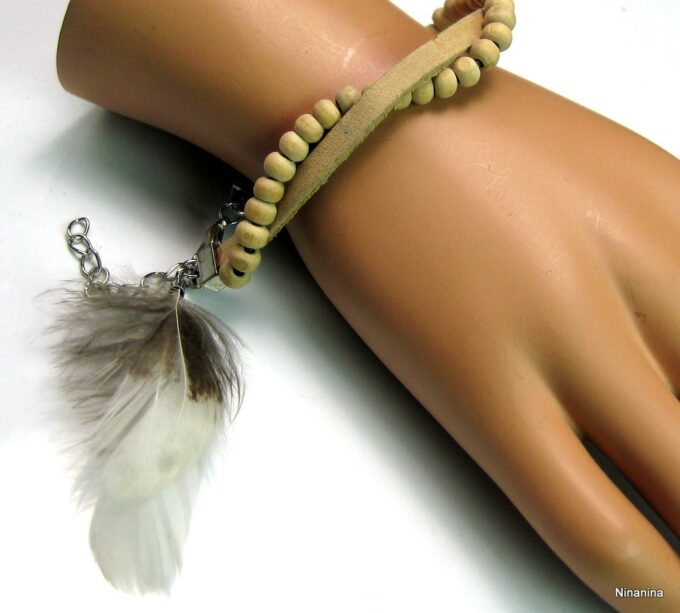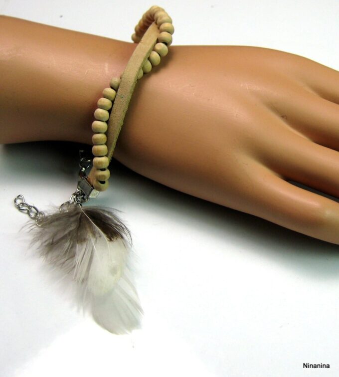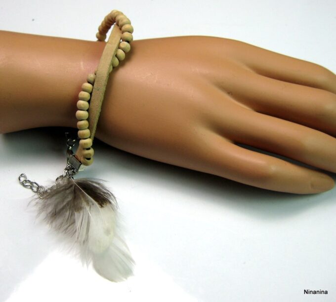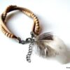 Bracelet cuir, plumes et perles de bois