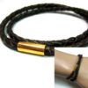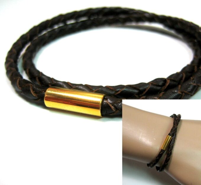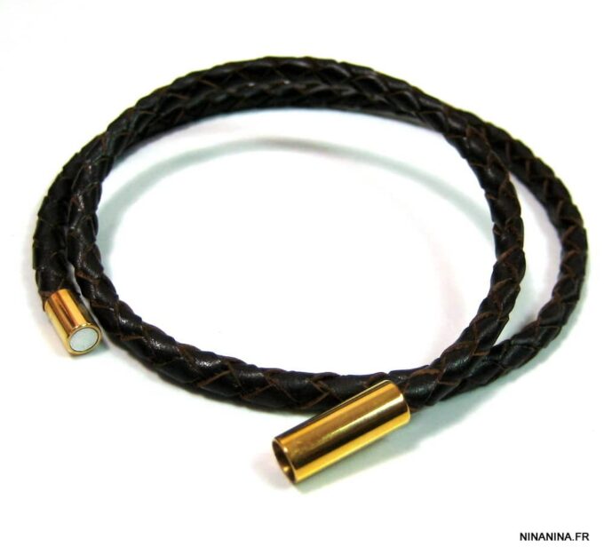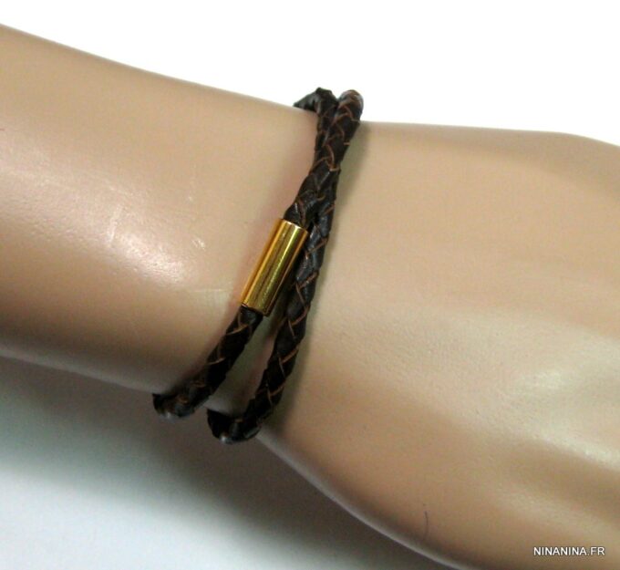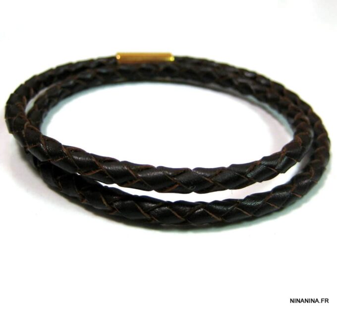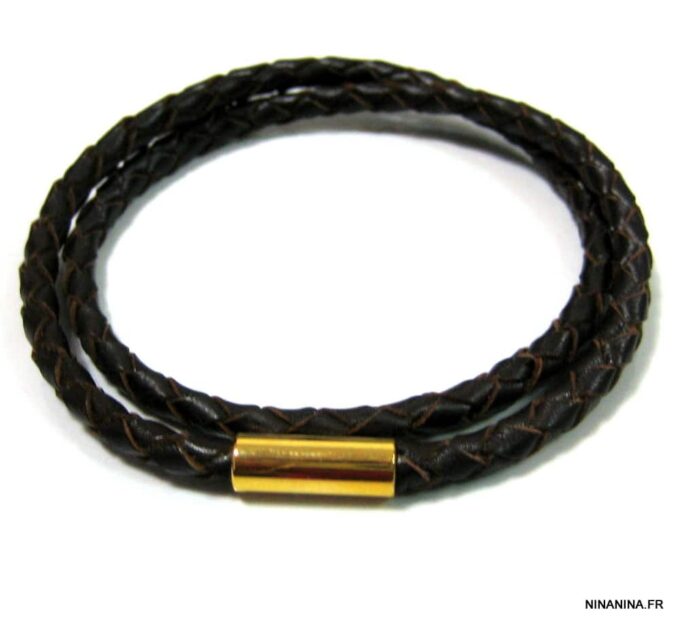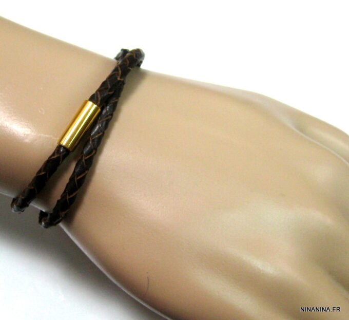 A la recherche d’un bracelet masculin qui allie classe et sobriété? Ce magnifique Bracelet cuir tressé marron homme acier inoxydable doré composé d’un fermoir cylindrique aimanté en acier inoxydable doré monté sur un cordon de cuir tressé marron chocolat (4 mm de diamètre) à enrouler autour du poignet (2 tours), est fait pour vous!