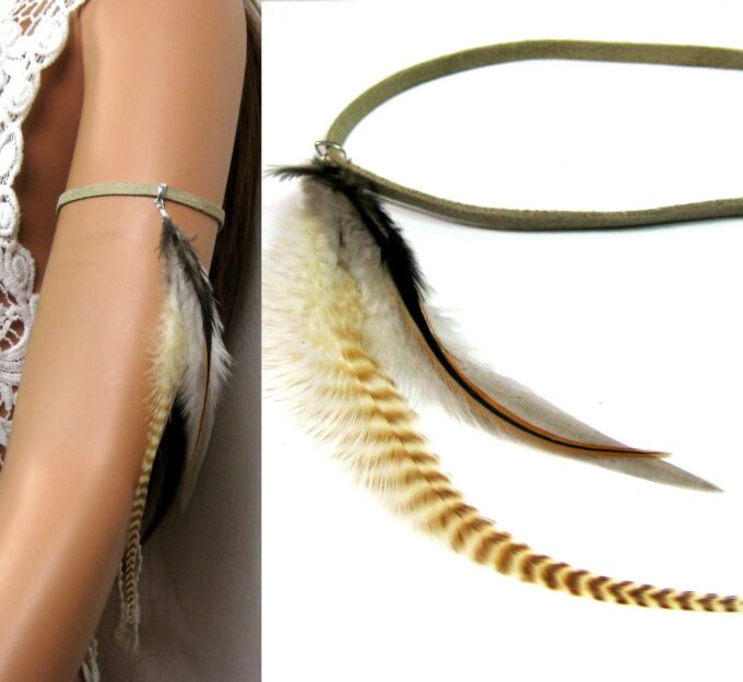 Bracelet de biceps plumes Argent 925 cordon cuir composées de longues plumes blanches et marron clair montées sur un lien de daim couleur naturel (5 mm de large). Dim des plumes : 22 x 1,5 cm env. Longueur (fermoir compris) : 25 cm environ. Fermoir mousqueton et chainette de rallongement. Livré dans sa pochette d’organza.