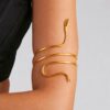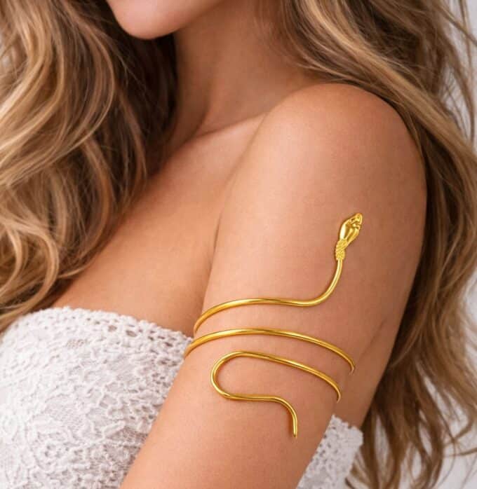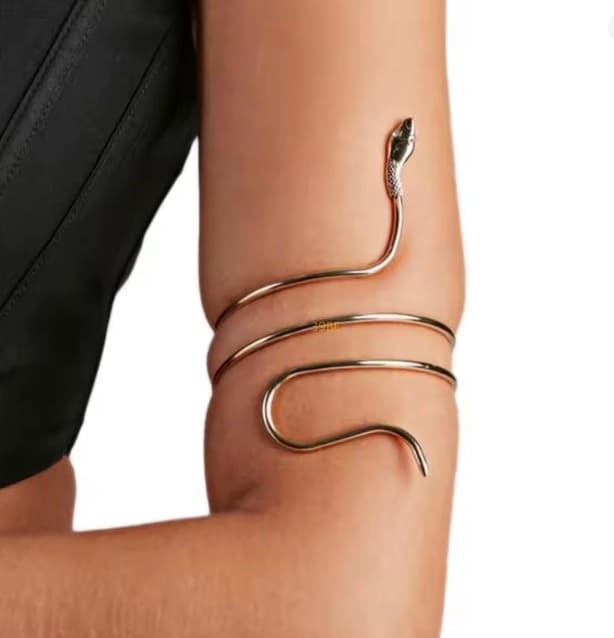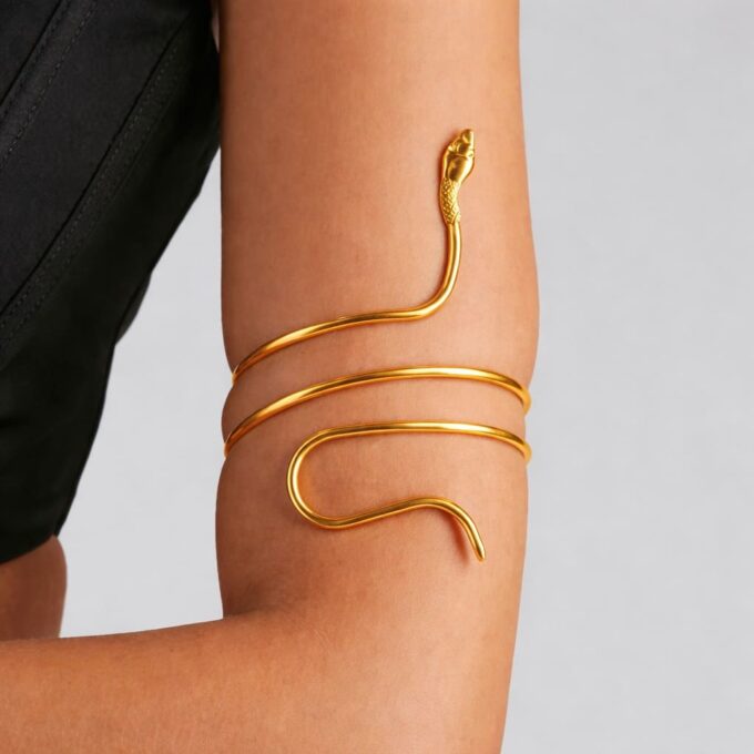 Ce bracelet de biceps serpent doré est conçu pour être porté sur le haut du bras, légèrement au-dessus du biceps, afin de devenir la pièce phare de votre tenue. Il sublime particulièrement les tops sans manches, les robes bustier, les robes à fines bretelles ou les tenues dos nu. Sa finition dorée capte la lumière et met en valeur la peau, surtout en été ou lors d’événements festifs.