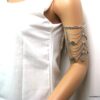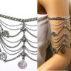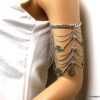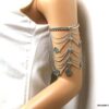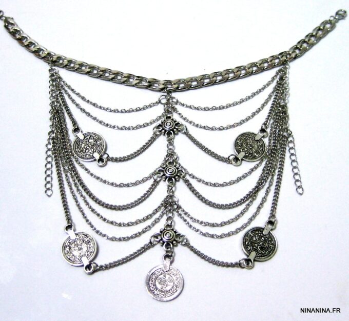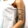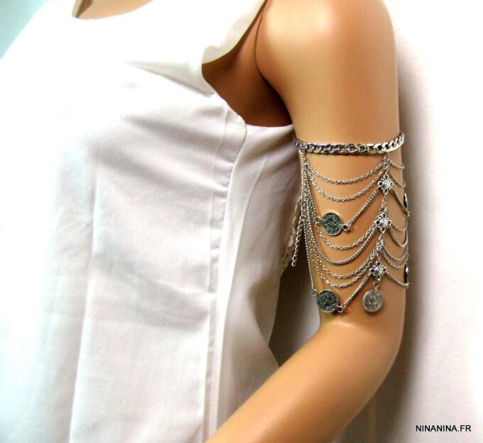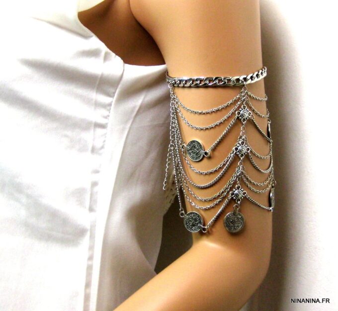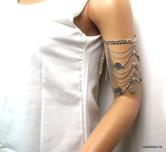 Bracelet de biceps métal argenté composé d’entretoises carrées et de pièces rondes montées sur une chainette en métal argenté. Fermoir mousqueton et chainette de rallongement. Dim : 7 X 13 cm. Longueur (fermoir compris) : 25 cm ajustable. Livré dans sa pochette d’organza.