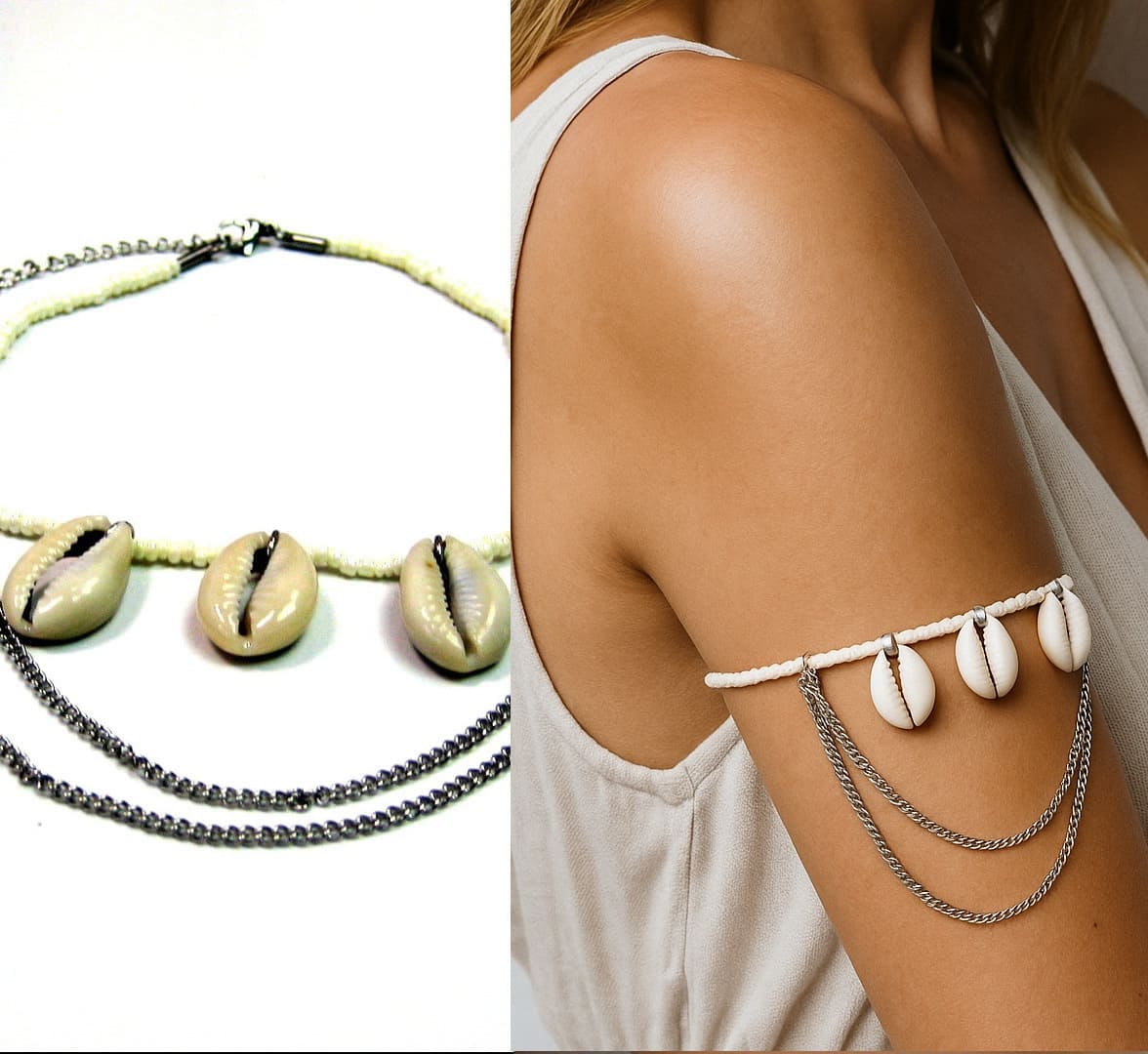 Les coquillages Cauris véritables sont polis pour révéler leur éclat nacré, puis associés à des perles de rocaille blanches qui reflètent la lumière avec subtilité.