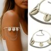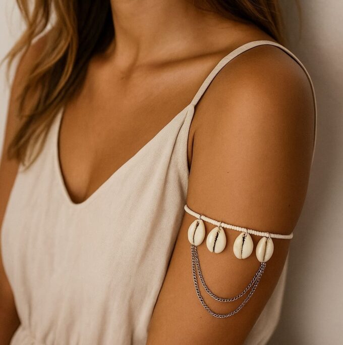 Ce bracelet au bras orné de coquillages Cauris est une pièce artisanale unique, confectionnée à la main avec des matériaux naturels et délicats.