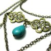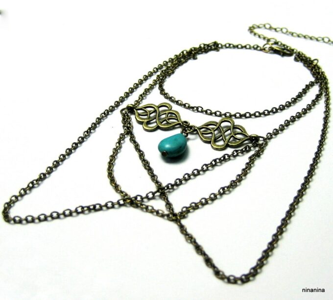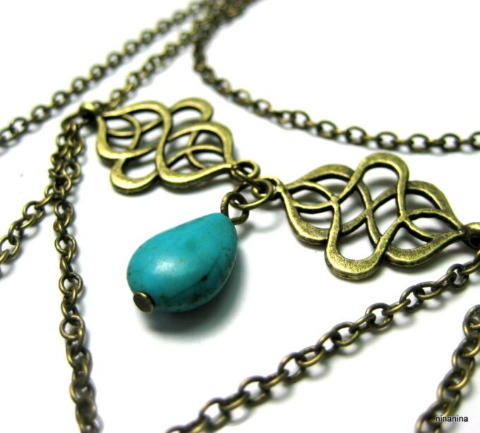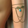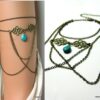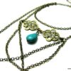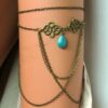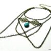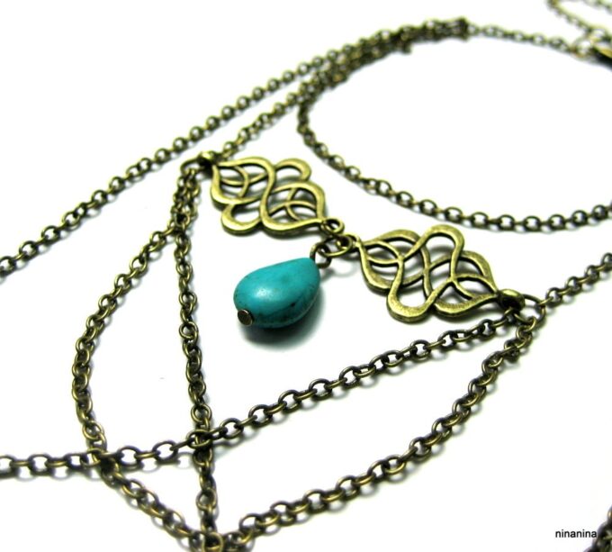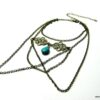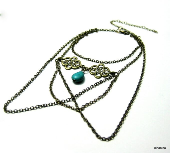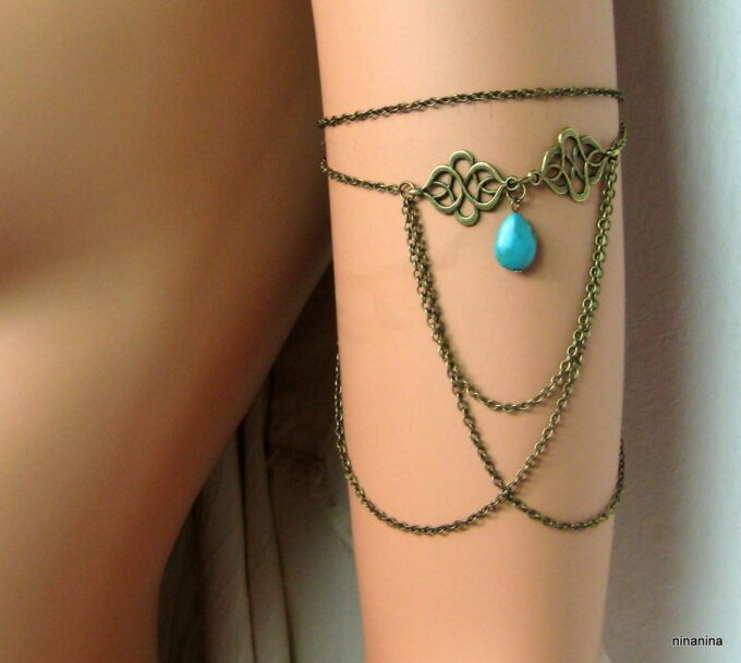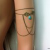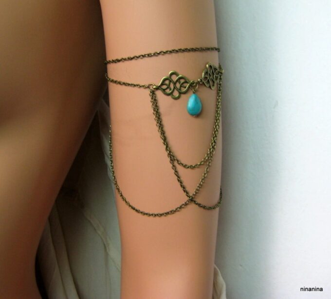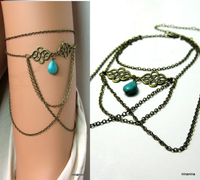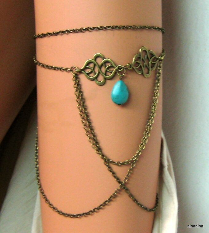 Bracelet de bras métal bronze composé d’estampes en métal argenté et d’une goutte en verre turquoise montées sur une chainette en métal argenté. Fermoir mousqueton et chainette de rallongement. Largeur : de 24 à 32 cm environ réglable. Existe aussi en métal bronze. Livré dans sa pochette d’organza. Bijou 100% fait-main
