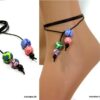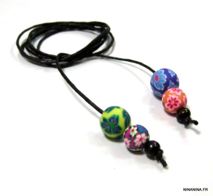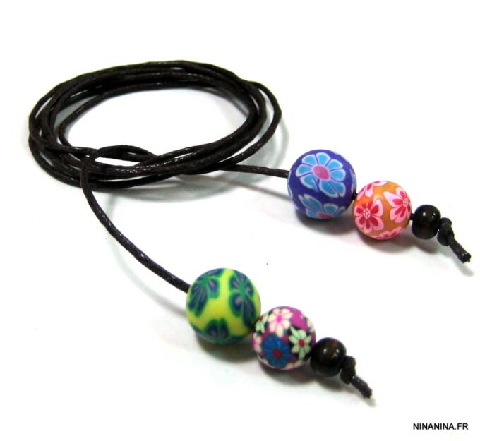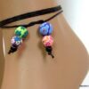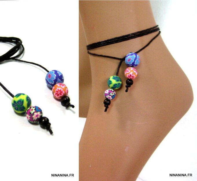 Bracelet cheville pas cher perles multicolores polymere composé de quatre perles de polymere et de deux perles en bois (12, 10 et 6 mm) montées sur un cordon de coton ciré (1mm) marron chocolat.