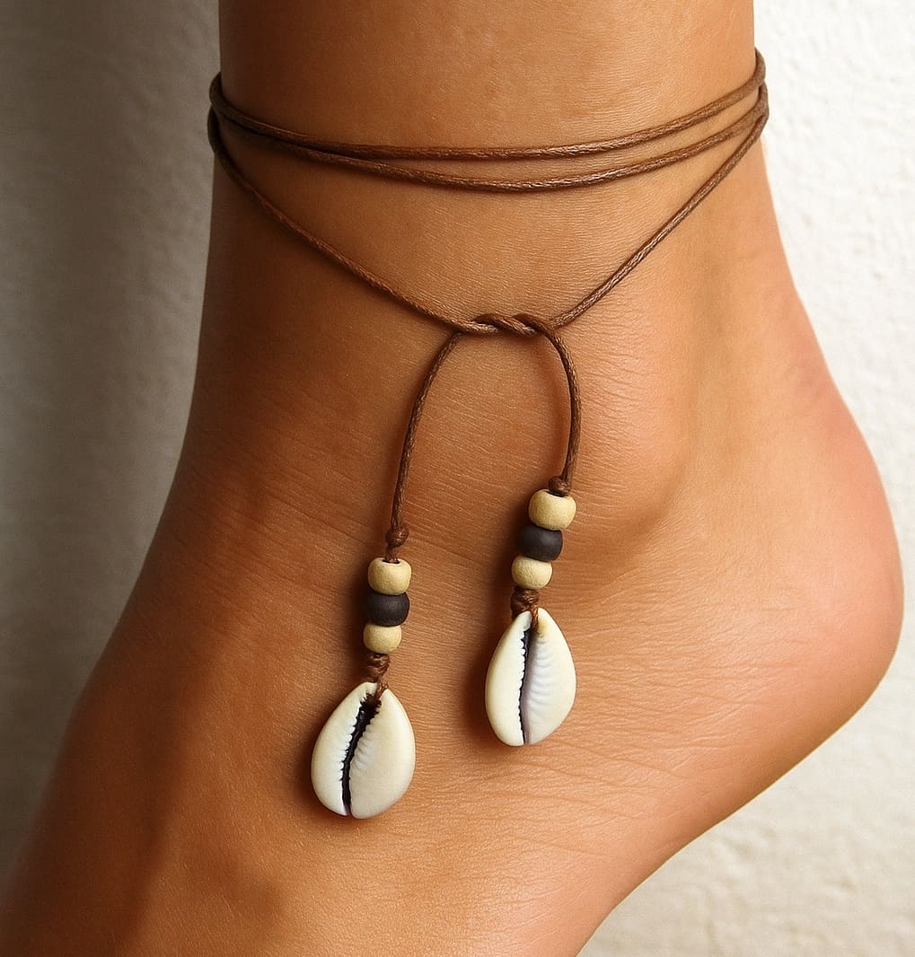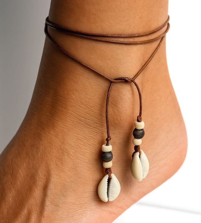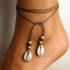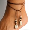 Bracelet coquillage cheville cordon pour femme composé de coquillages grain de café et de perles de bois montés sur un cordon de coton ciré marron clair.