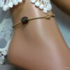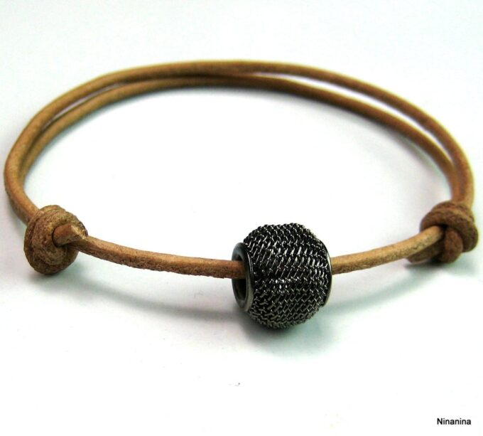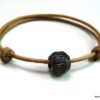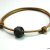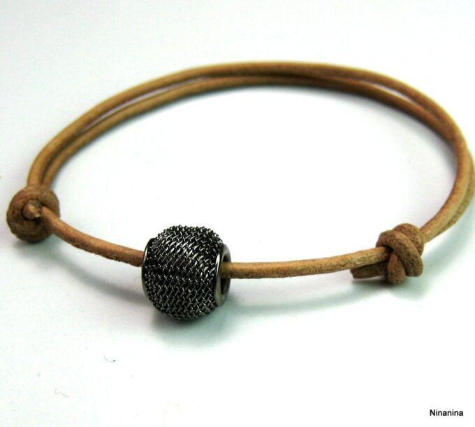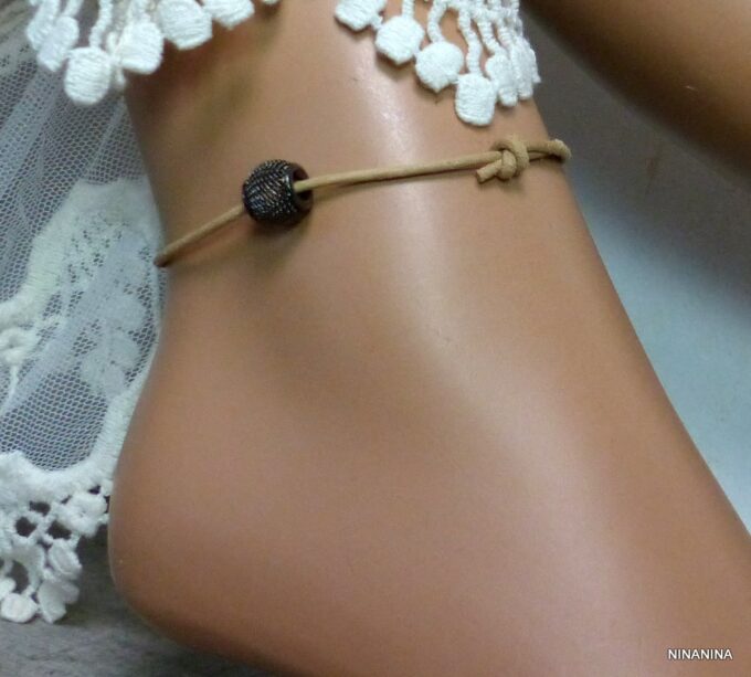 Bracelet de cheville cordon cuir perle métal résille noire composé d’une perle résille en métal noir montée sur un cordon de cuir naturel (2 mm de diamètre).