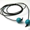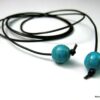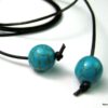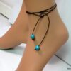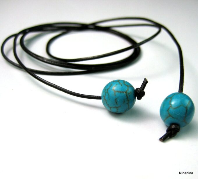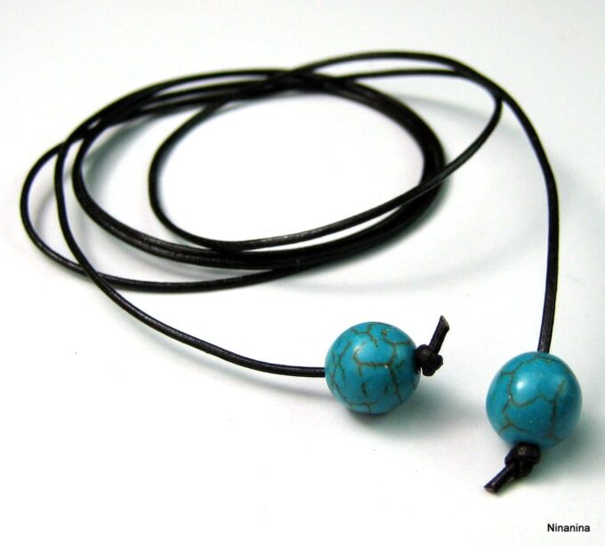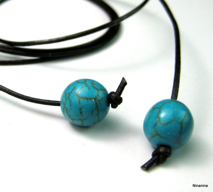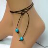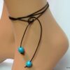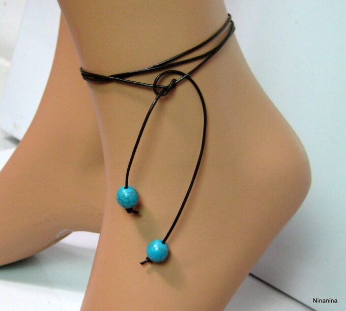 Bracelet de cheville cordon composé de perles rondes turquoises et en bois montées sur un cordon en cuir marron chocolat (1mm de diamètre) à enrouler autour de la cheville. Dimètre de la perle turquoise : 1 cm. Existe aussi avec un cordon cuir noir, naturel, gris, rouge, turquoise (merci de préciser votre choix en commentaire au moment de la commande). Longueur : 80 cm env. Fermeture par un noeud simple. Livré dans sa pochette d’organza.