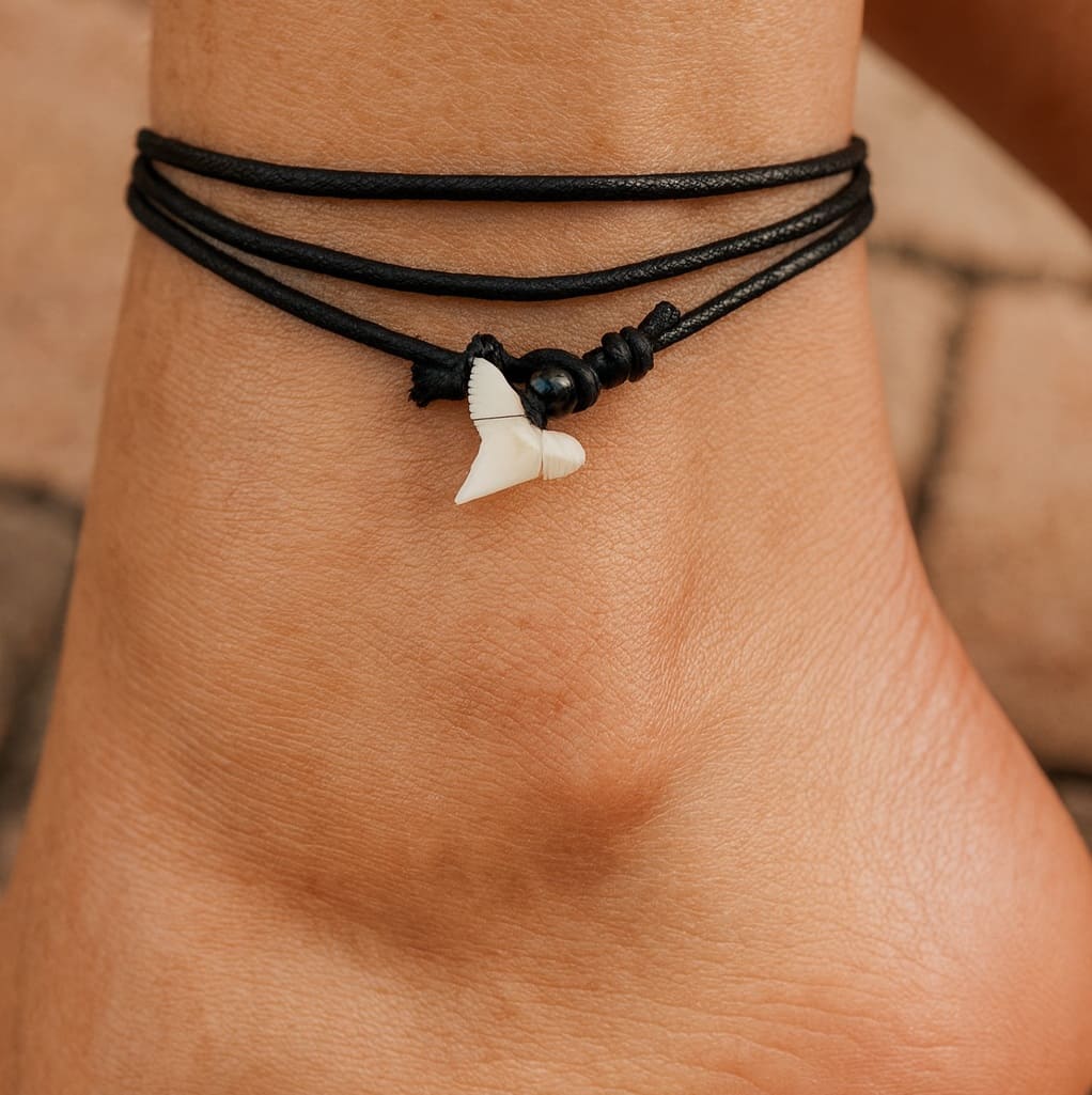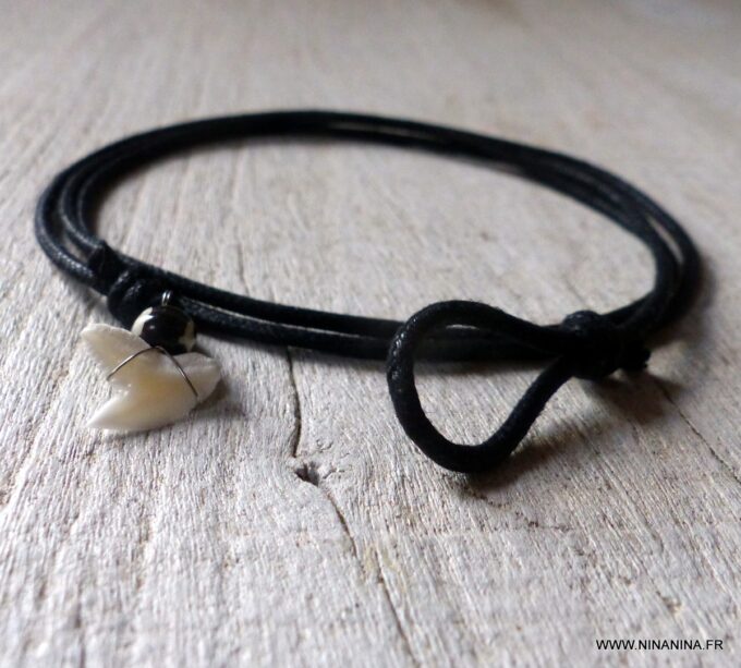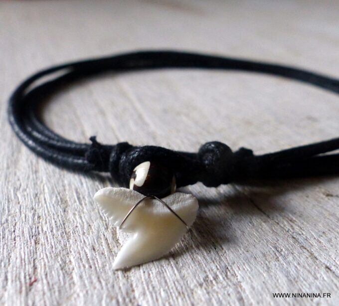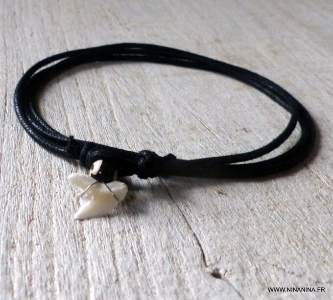Entre crainte et fascination, entre bijou amulette et symbole de virilité, ce Bracelet de cheville ethnique pendentif dent de requin composé d’une petite dent de requin véritable monté sur cordon de coton ciré noir, à enrouler autour de la cheville (3 tours), est celui qu’il vous faut !