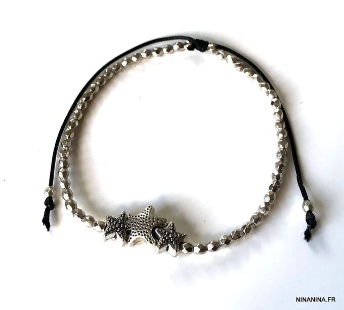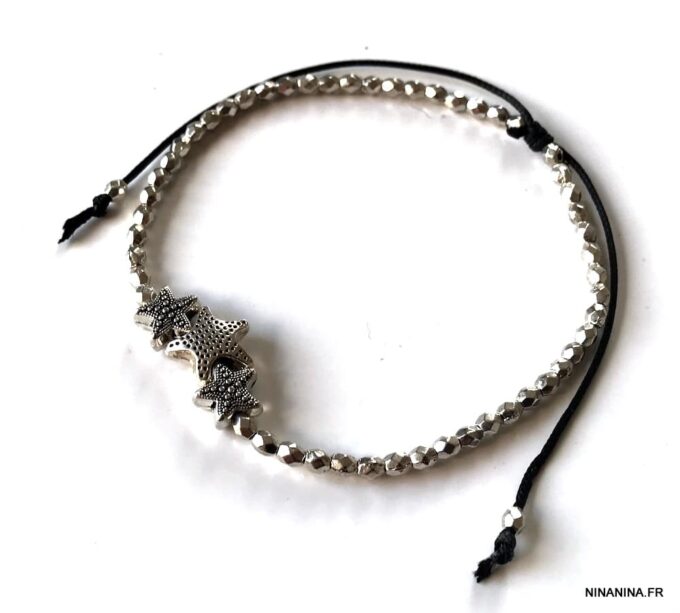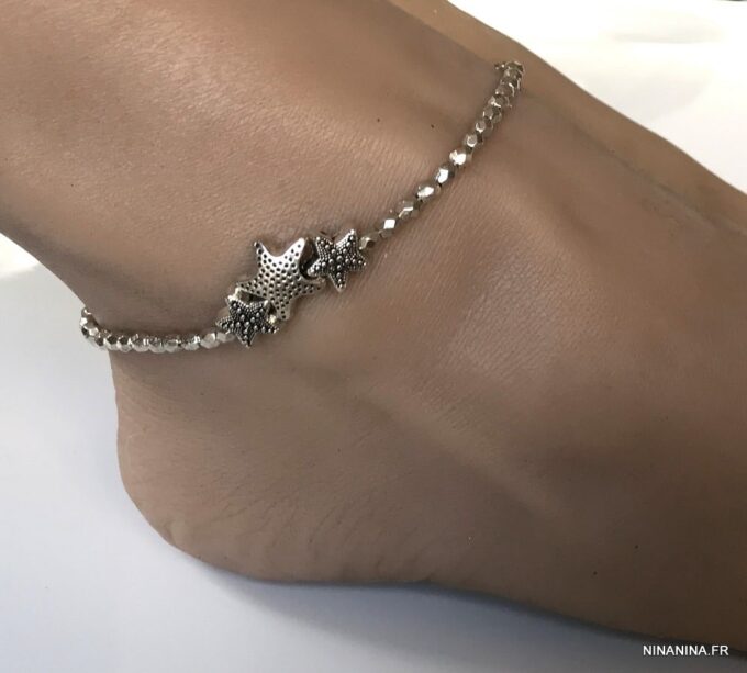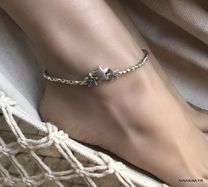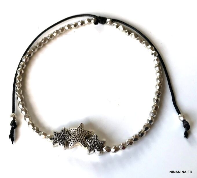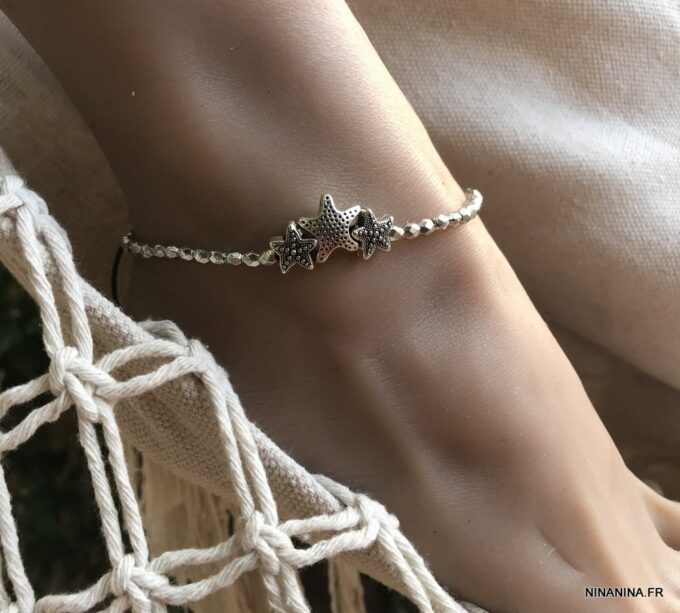 Faites des jalouses sur la plage cet été avec ce superbe Bracelet cheville etoile de mer fantaisie pour femme ! Ce bracelet de cheville est composé de perles plates en forme d’étoiles de mer et de petites perles facettées argentées montées sur un cordon de coton noir ajustable.