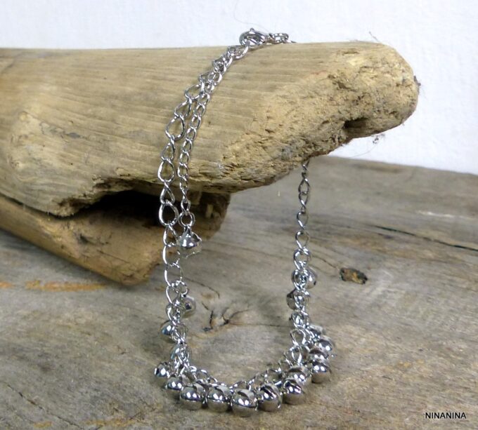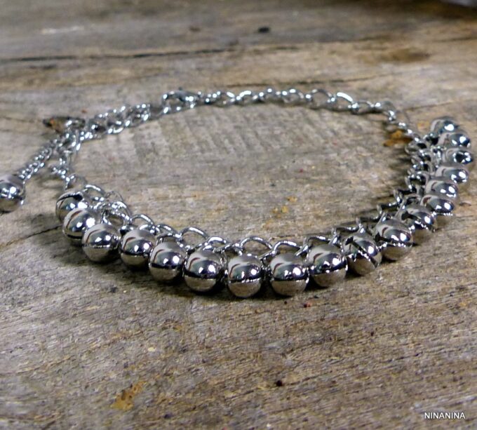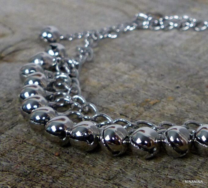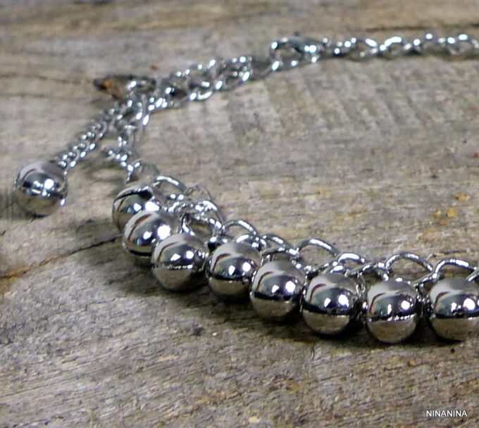 Bracelet cheville indien grelots métal argenté femme composé de grelots en métal argenté montés sur une chainette en métal argenté. Fermoir mousqueton et chainette de rallongement. Longueur totale (ajustable): jusqu’à 27 cm env. Livré dans sa pochette d’organza. Bijou 100% fait-main