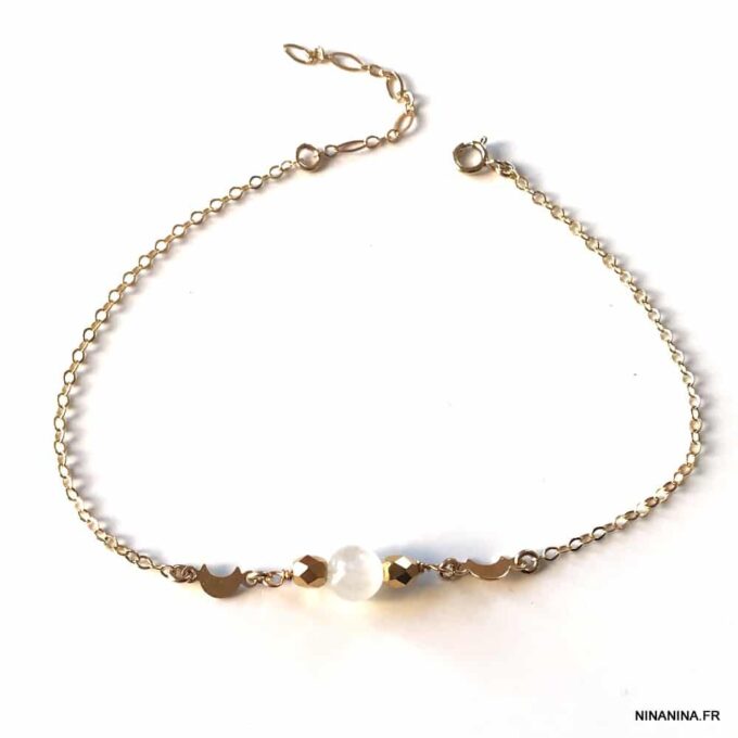 Laissez-vous séduire par cette Chaine de cheville pierre de lune Plaqué Or composée d’une perle en pierre de lune  naturelle, de perles à facettes et de connecteurs croissant lune en plaqué or 14 carats montées sur une chainette en plaqué or 14 carats gold filled! Cette Chaîne de cheville, aussi appelée chevillère ou chaine de pied, est terminée par un fermoir rond à ressort, sûr et facile d’utilisation, elle habillera votre pied avec sensualité.