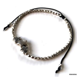 Bracelet cheville avec coquillage sur cordon cuir naturel composé d’une pièce en métal argent et bronze, de tubes et de rondelles en métal bronze et de coquillages cauri montés sur un cordon de cuir naturel (2mm de diamètre).