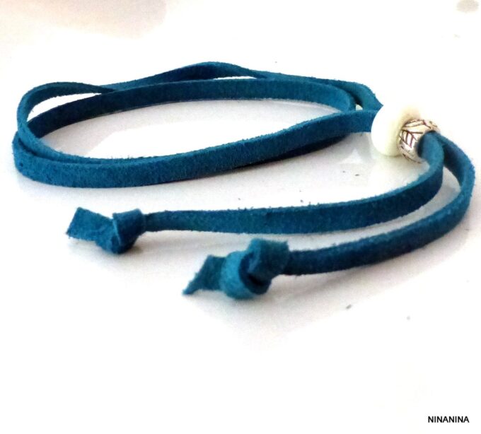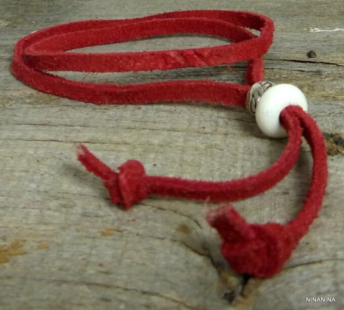 Bracelet de cheville lacet daim rouge composé de rondelles de céramique blanche et métal argenté montées sur un lacet de daim rouge (5mm de large), à enrouler autour de la cheville (2 tours).  Fermeture coulissante. Longueur totale (ajustable): jusqu’à 59 cm env. Livré dans sa pochette d’organza. Bijou 100% fait-main