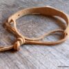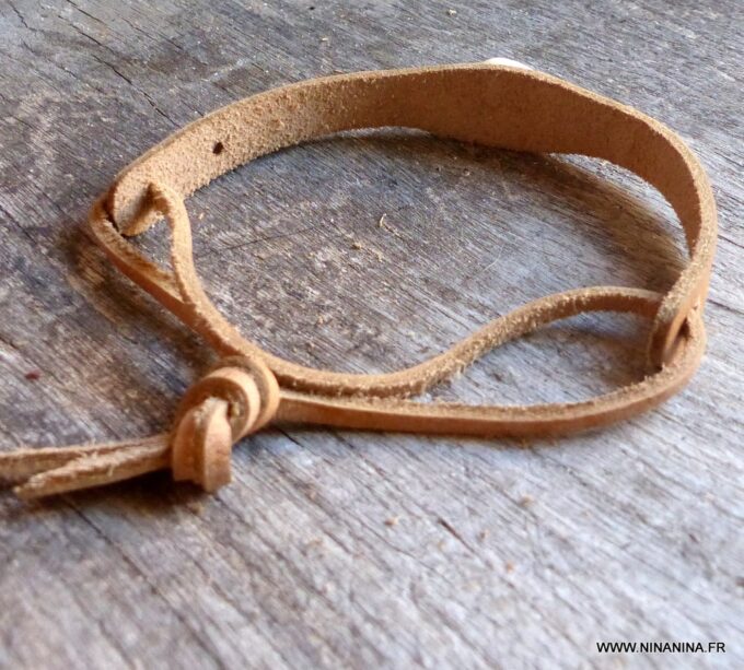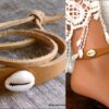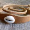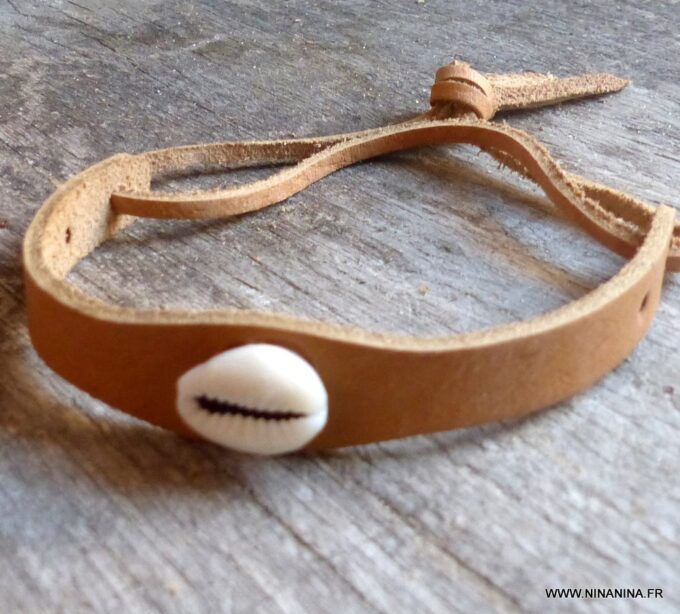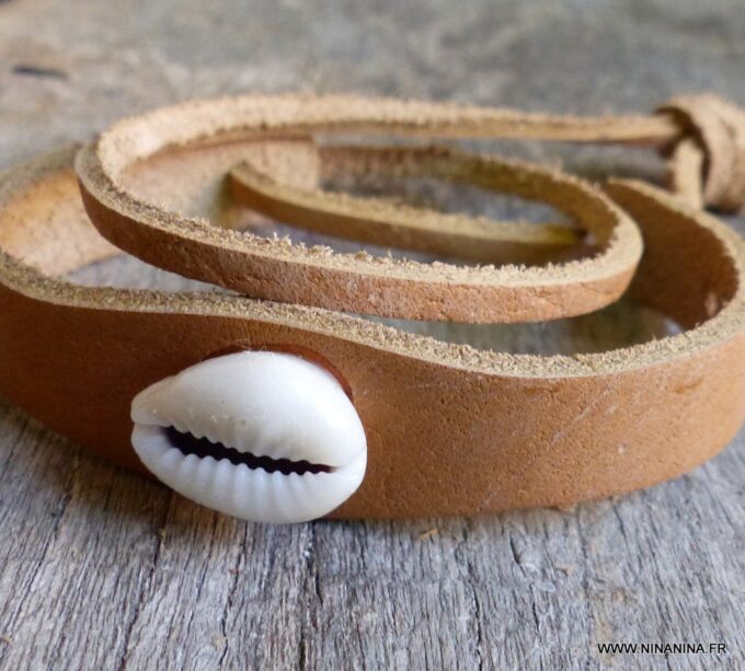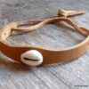 Bracelet de cheville lanière cuir coquillage cauri composé d’une lanière de cuir marron clair et d’un coquillage cauri.