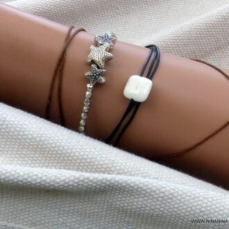Bracelet de cheville pas cher peace and love composé d’un pendentif peace et d’un coeur en métal argenté montés sur un cordon de coton ciré gris (1mm).