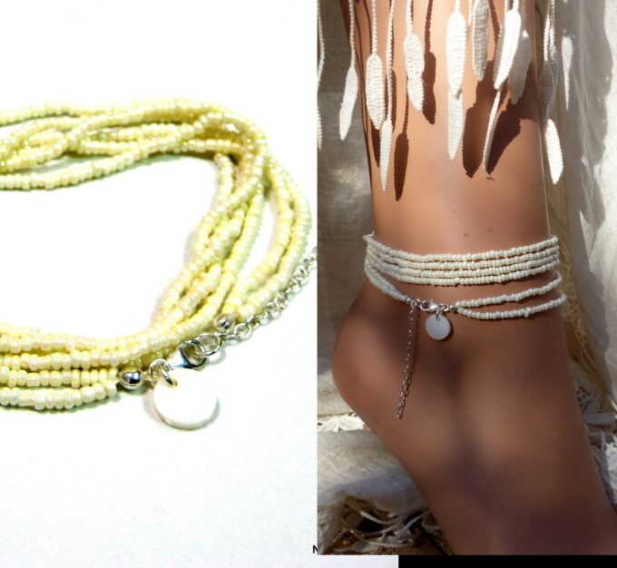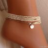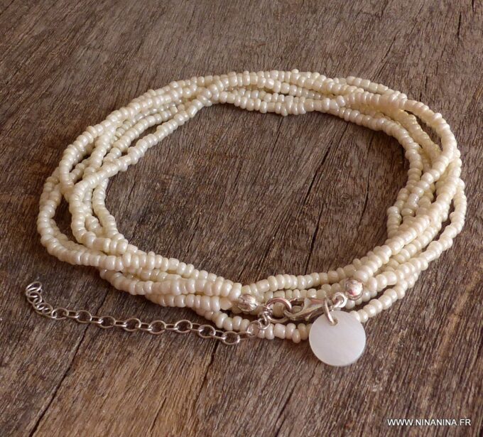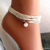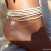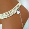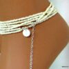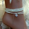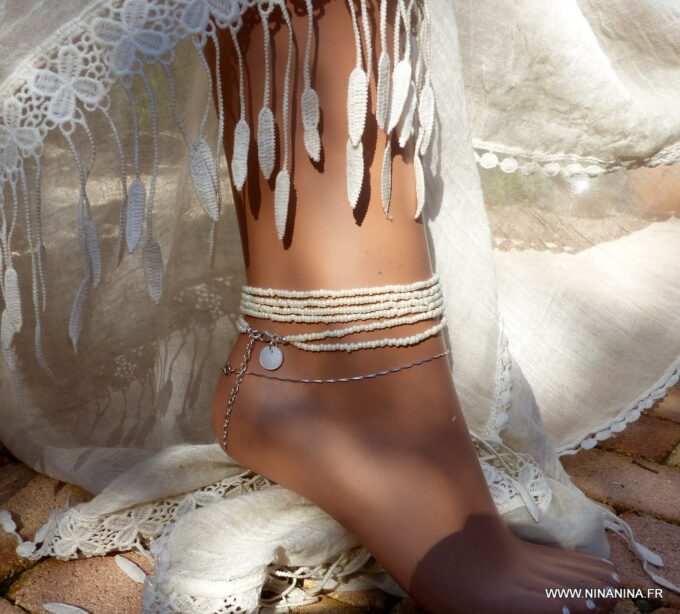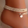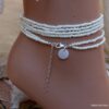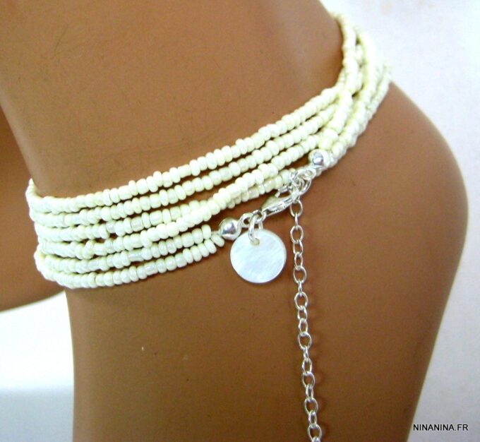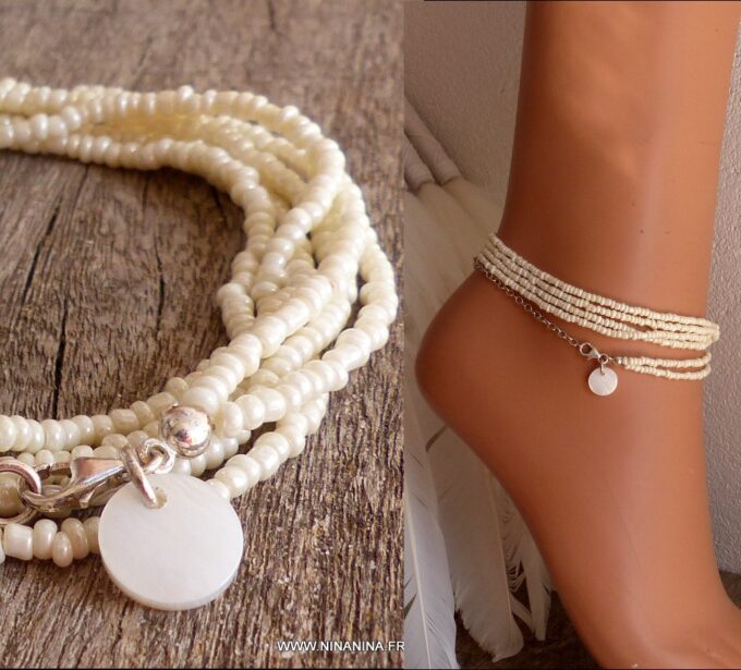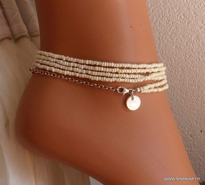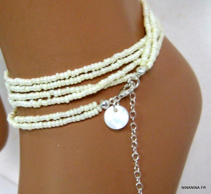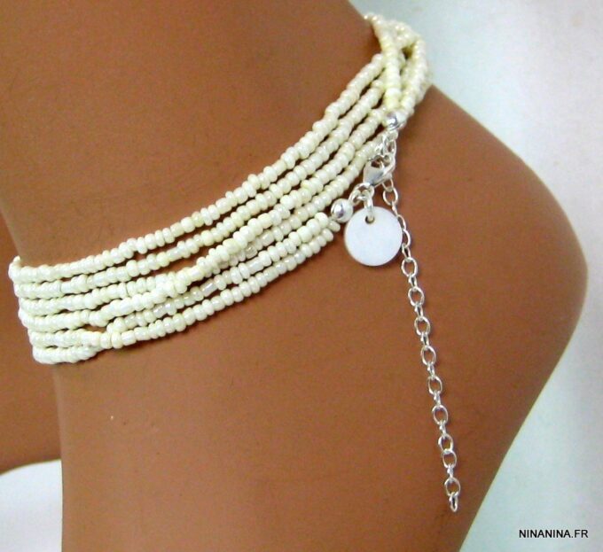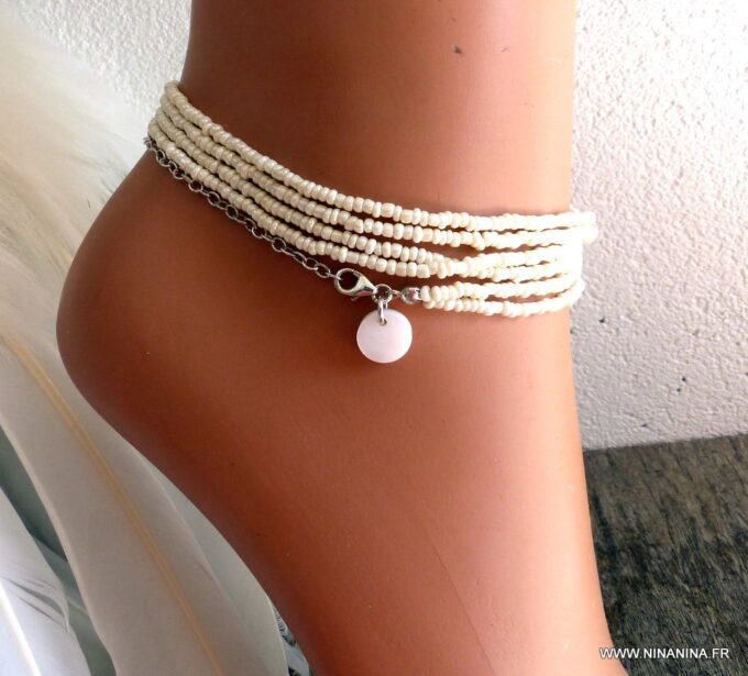 Chaine de cheville perles de rocaille nacre blanche composé d’un triple rang de perles de rocailles blanches et d’une pastille en nacre blanche à enrouler autour de la cheville (3 tours).