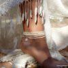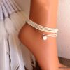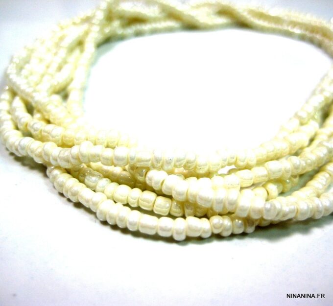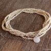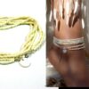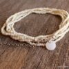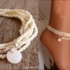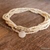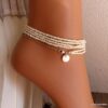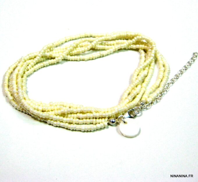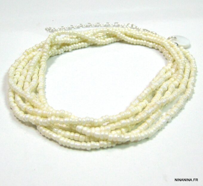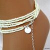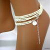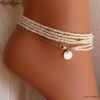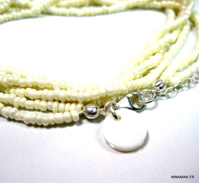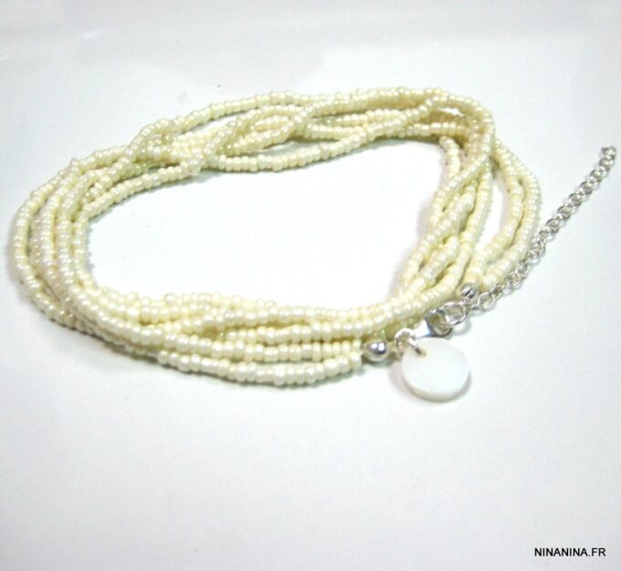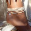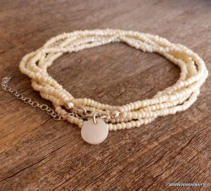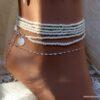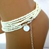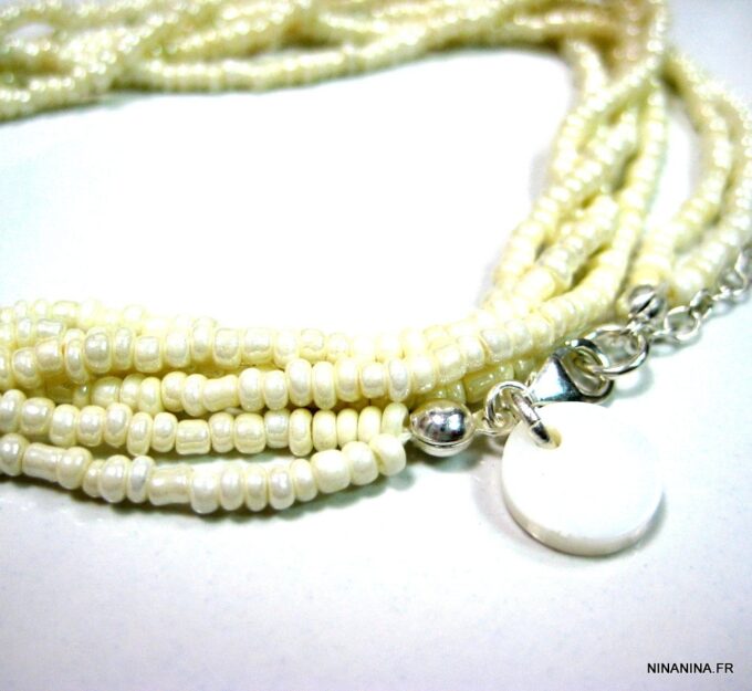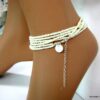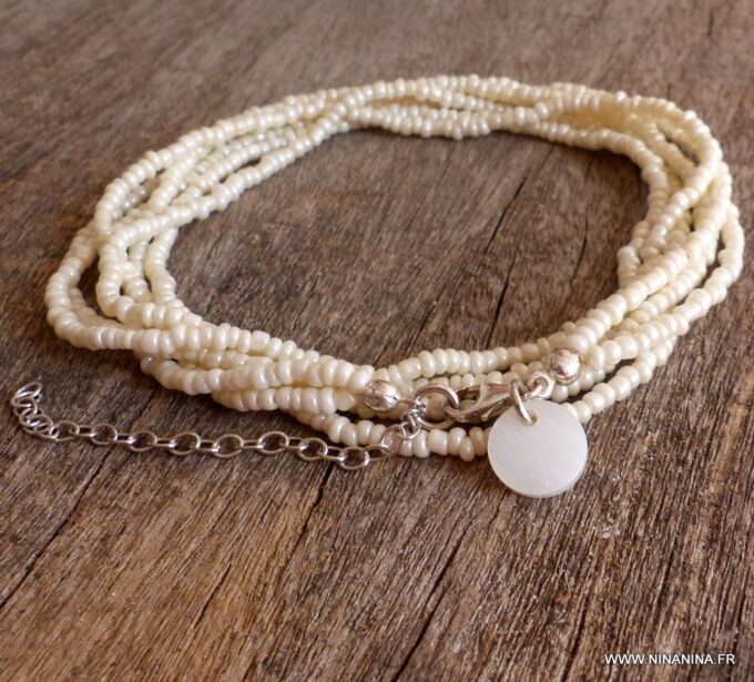 Chaine de cheville perles de rocaille nacre blanche composé d’un triple rang de perles de rocailles blanches et d’une pastille en nacre blanche à enrouler autour de la cheville (3 tours).