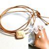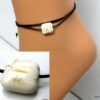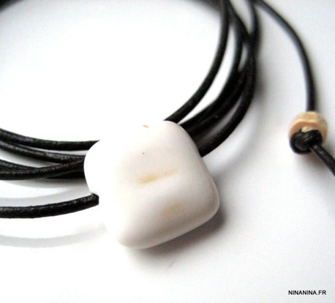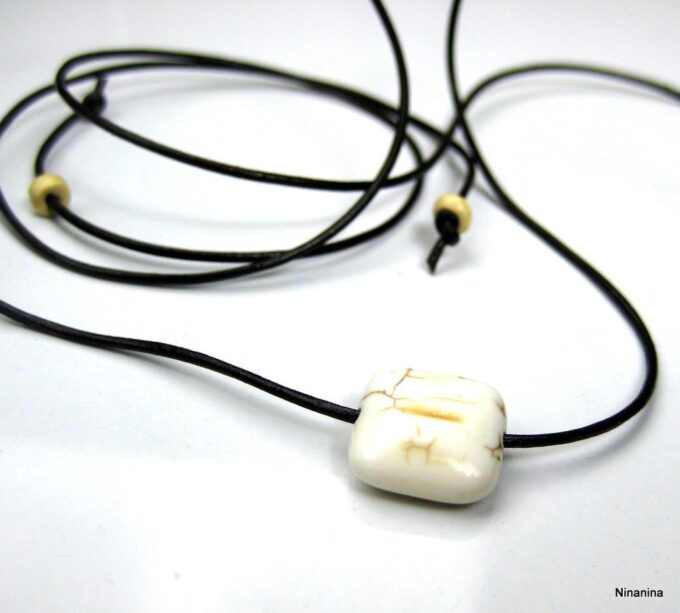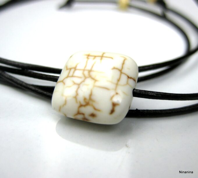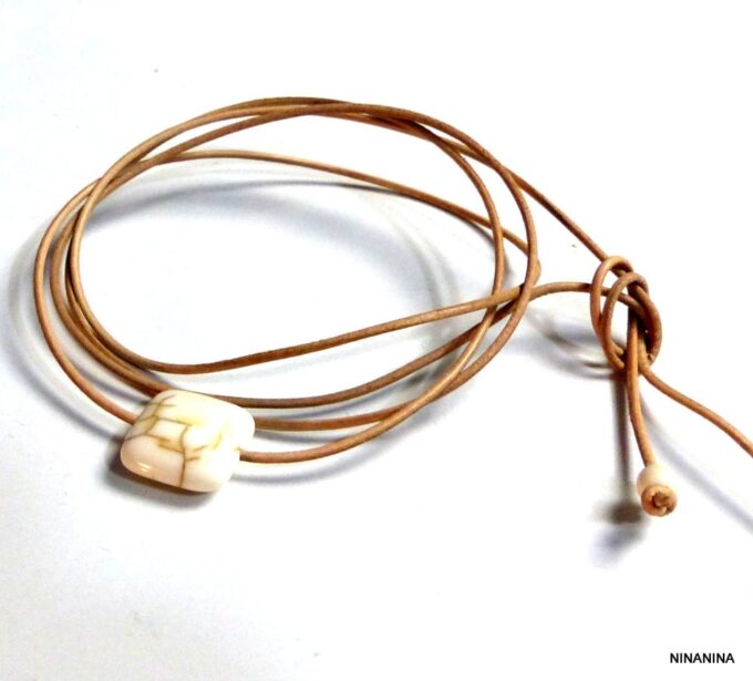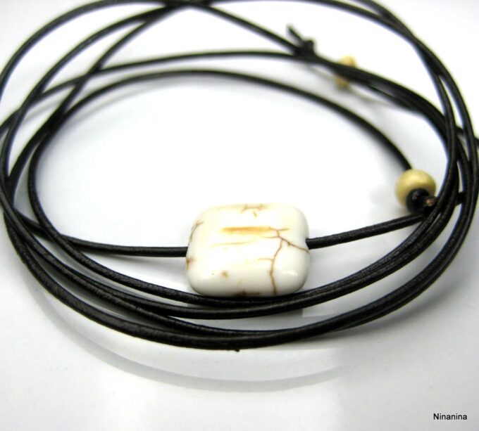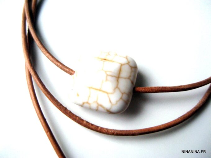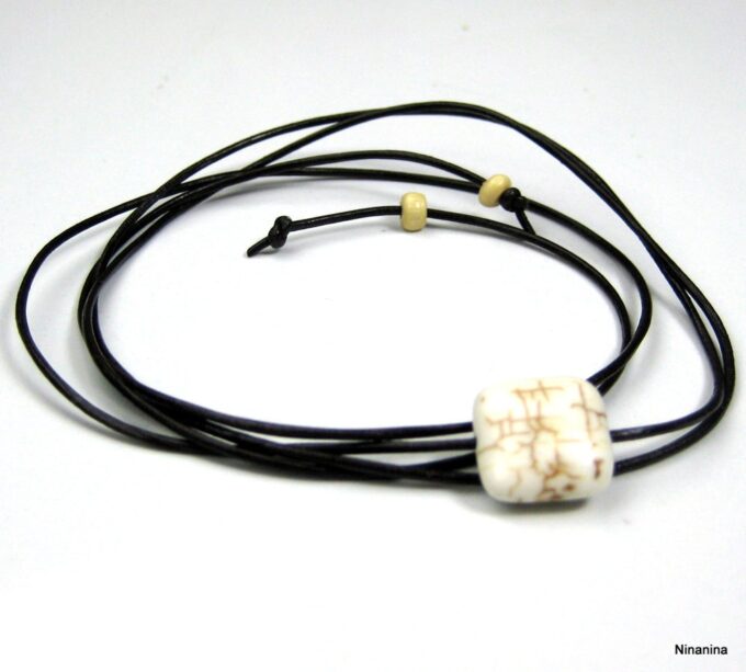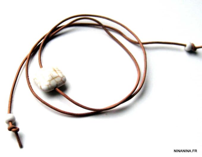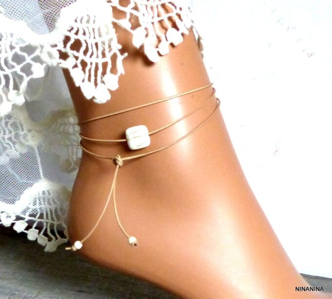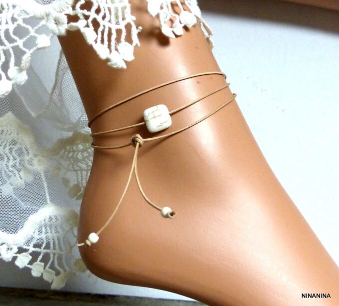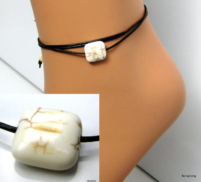 Offrez un look boho chic à votre cheville avec cette Chaine de cheville cordon cuir perle howlite carrée composé d’une perle carrée en magnésite blanche et de deux petites perles rondes en bois montées sur un cordon de coton ciré naturel (1mm de diamètre) à enrouler autour de la cheville qui vous accompagnera tout au long de l’été. Un bracelet de cheville cordon que vous adorerez porter à la plage aussi bien qu’au bureau sur votre peau bronzée.