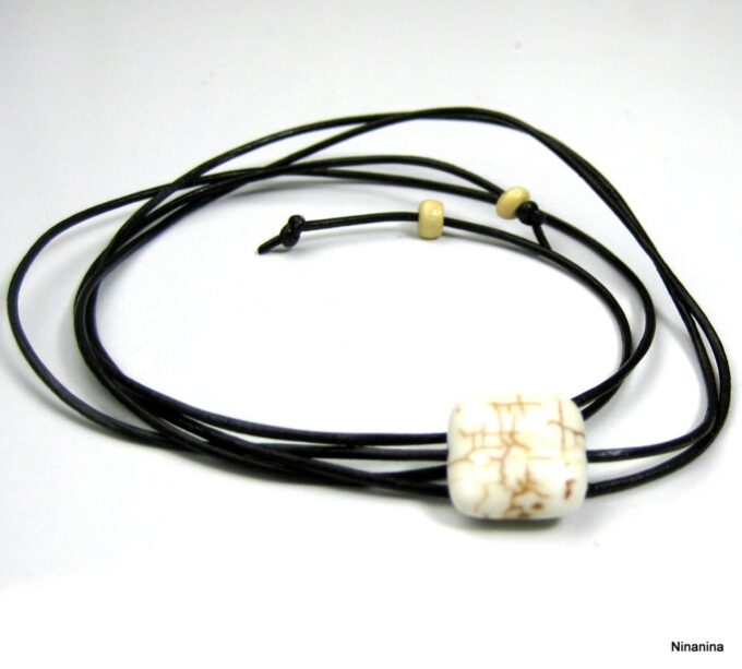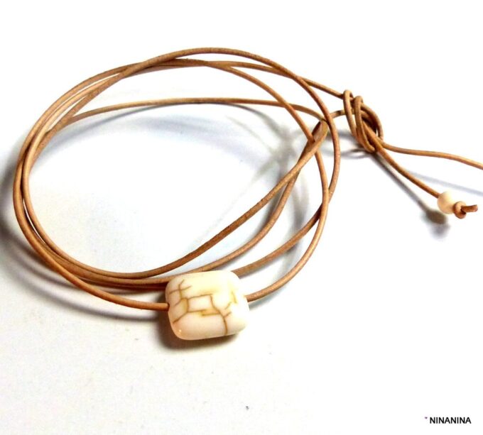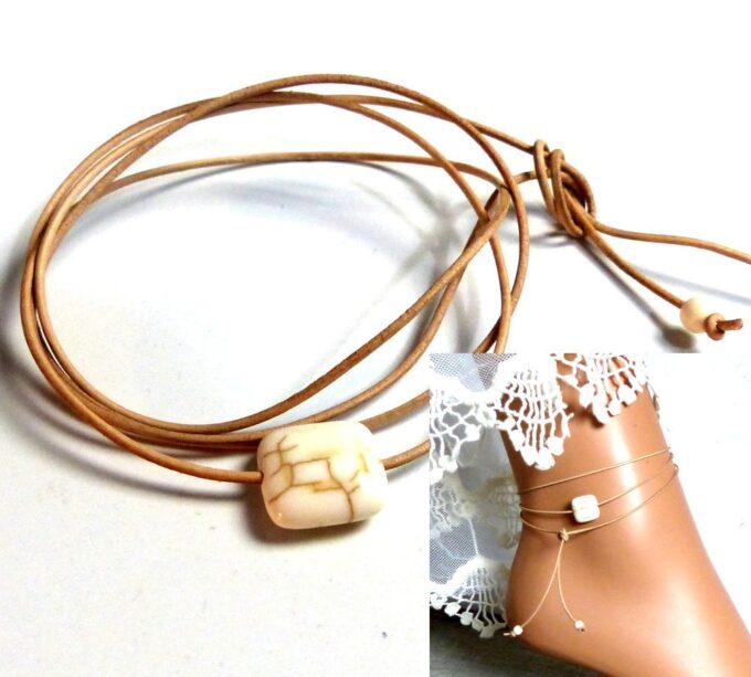 Ce bracelet de cheville ethnique est unique et fabriqué à la main, de façon artisanale et en quantité limitée dans notre atelier du sud de la France. Il est fabriqué sur mesure et est réglable; La fermeture se fait par un noeud simple, Longueur ajustable : 80 cm env. Dim de la perle en howlite: 1,2 X 1,2 cm env. Le cordon est disponible au choix en naturel, turquoise, rouge, marron clair, marron chocolat et noir.