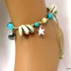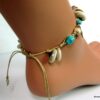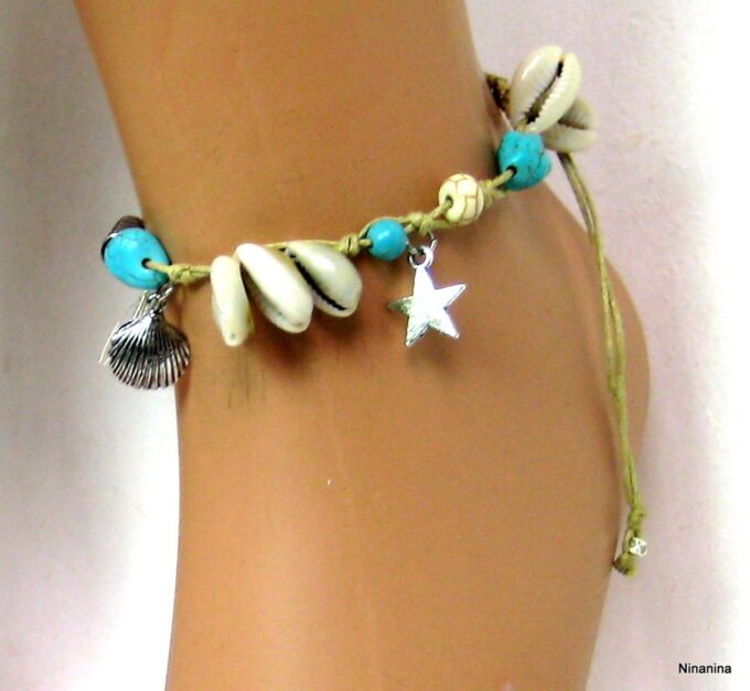 Bracelet cheville coquillages cauris perles turquoises composé de coquillages grain de café, perles turquoises et breloques en métal argenté montés sur un cordon de coton ciré sable (1mm de diamètre).