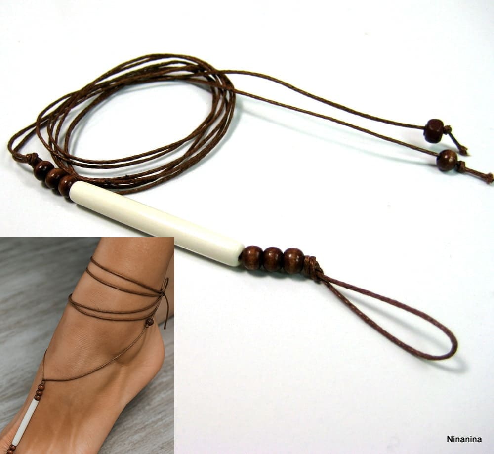 Bijou de pied cordon et tube os blanc composé d’un tube en os organique blanc et de petites perles en bois marron chocolat montés sur un lacet de coton ciré marron clair (1 mm de diamètre). Dim du tube : 5 X 0,5 cm. Longueur totale : 76 cm env. Fermeture par un noeud simple. Livré dans sa pochette d’organza. Bijou 100% fait-main