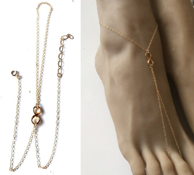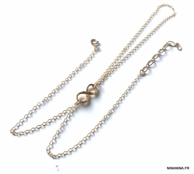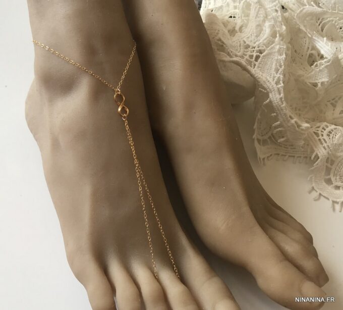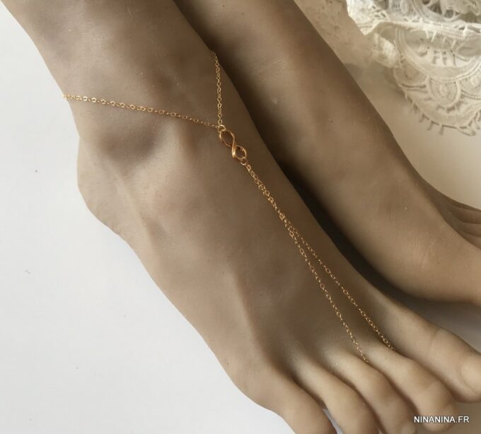 Chaine de pied Plaqué Or signe infini composé d’un symbole infini en argent 925 plaqué or 24 carats monté sur une chaine en plaqué or 14 carats .