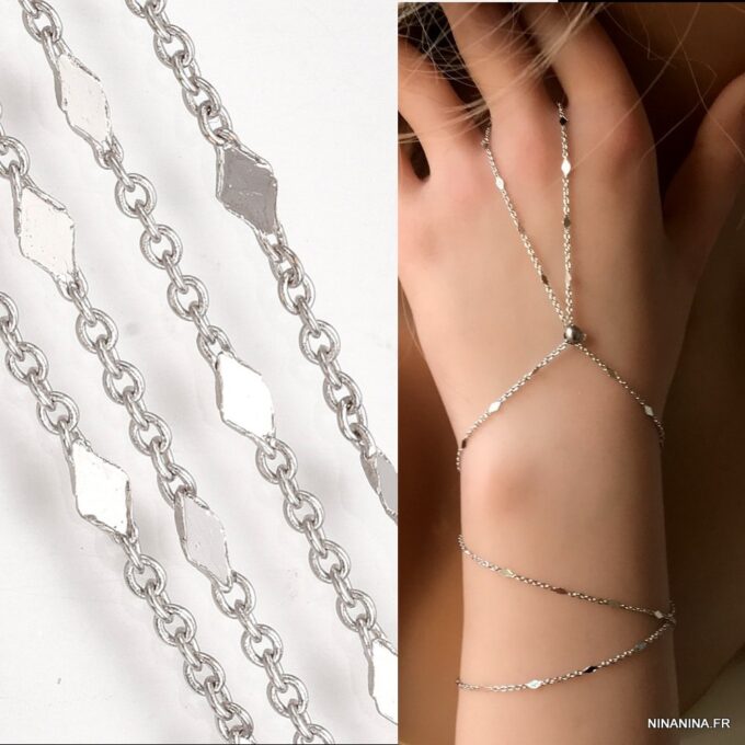 Laissez-vous séduire par ce splendide Bracelet doigt poignet femme chaine fantaisie losange qui s’adaptera à toutes vos tenues, des plus décontractées aux plus habillées. Avec ses petits losanges argentés délicatement répartis sur une fine chaînette en maille fantaisie qui s’enfile autour d’un doigt, court le long de votre main et enlace votre poignet, ce bijou de main est à la fois féminin et raffiné ! Il est terminé par un fermoir mousqueton, sûr et facile d’utilisation et d’une chainette de réglage.