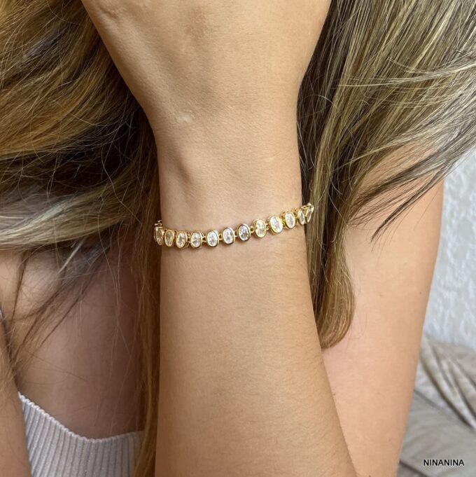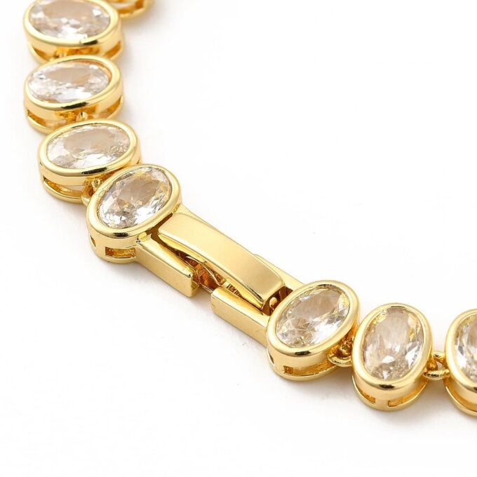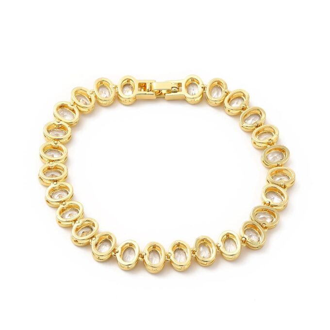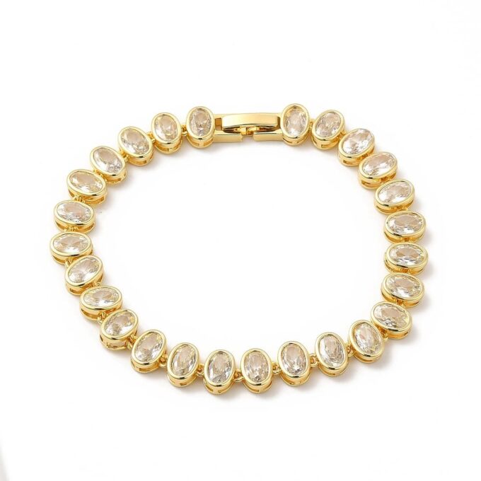 Apportez une touche de brillance à votre poignet avec ce bracelet doré pour femme au design sophistiqué et intemporel. Composé de maillons ovales sertis de zircons cubiques clairs, il imite parfaitement l’éclat du diamant tout en restant léger et accessible.