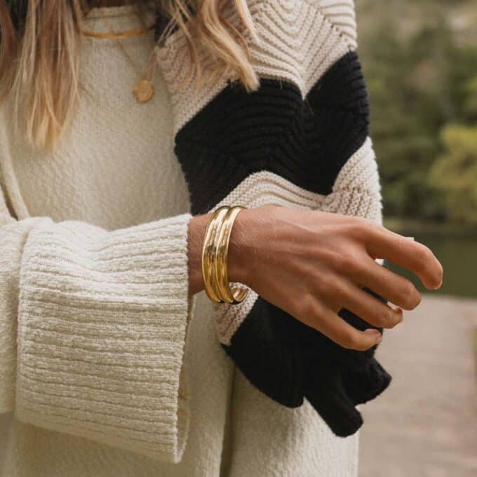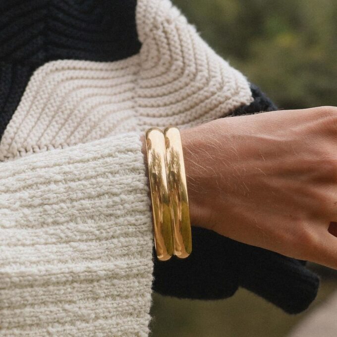 Associez ce bracelet doré manchette avec une montre fine ou d’autres bracelets minimalistes pour un effet superposé élégant. Portez-le avec une robe de soirée noire ou un chemisier blanc pour un contraste chic. Ce bijou s’adapte également parfaitement à un look bohème avec des tons naturels et des accessoires dorés.