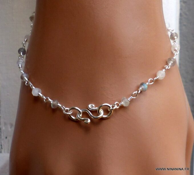 Ce Bracelet Pierre Lune Argent et Labradorite de haute qualité est unique et fabriqué à la main, de façon artisanale dans notre atelier du sud de la France. Il est terminé par un fermoir mousqueton ou un fermoir motif infini en Argent 925 au choix à selectionner dans le menu déroulant. Le diamètre des pierres est de 4mm.