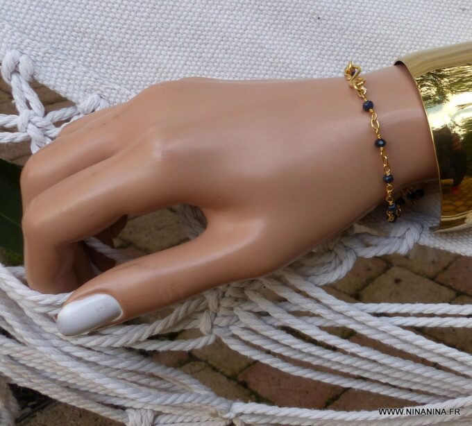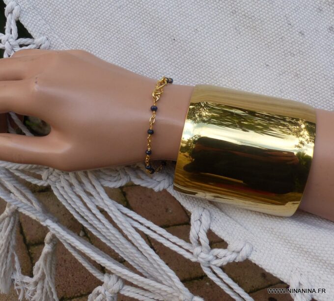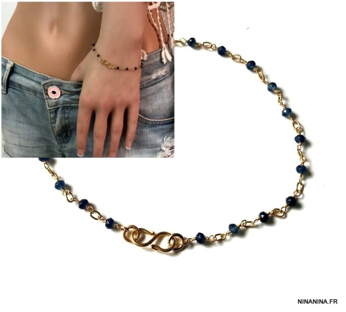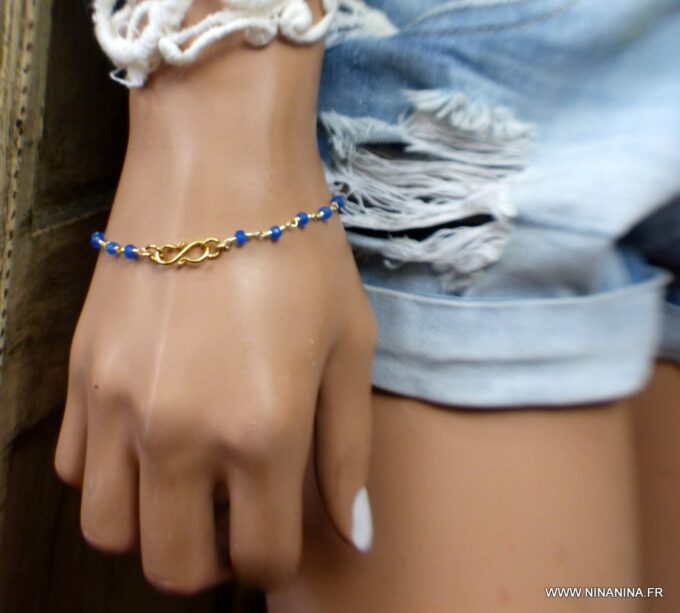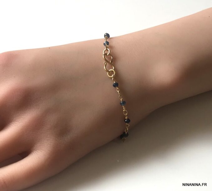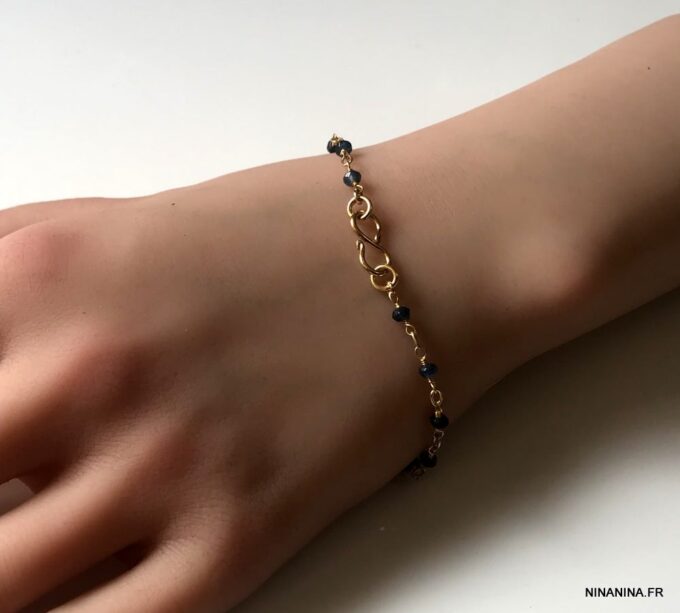 Bracelet saphir et fermoir symbole infini Plaqué Or composée de petits saphirs indiens bleus montés sur fil plaqué or.