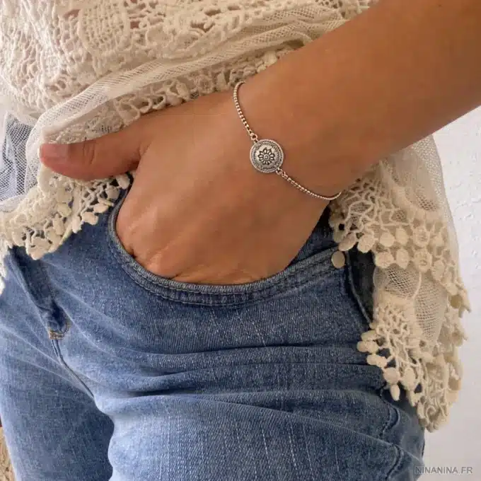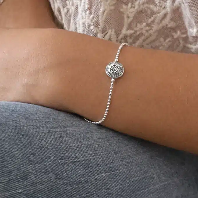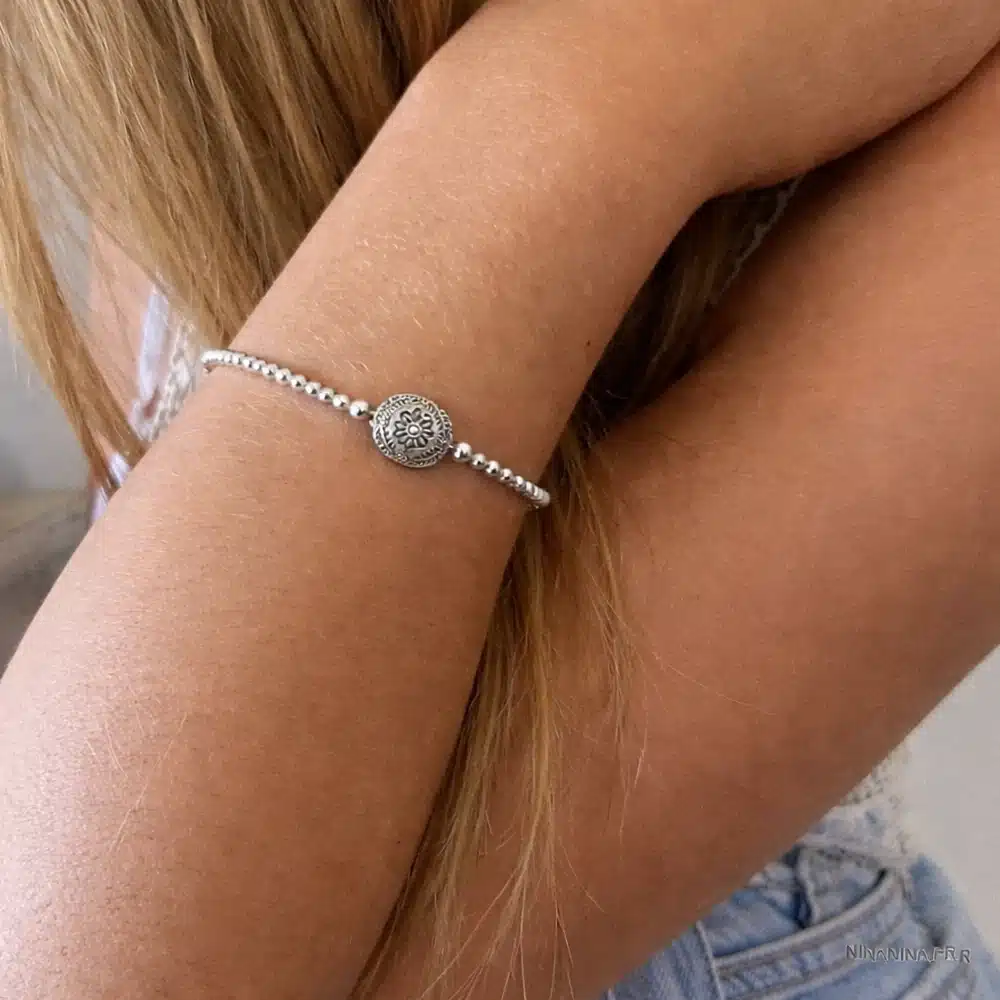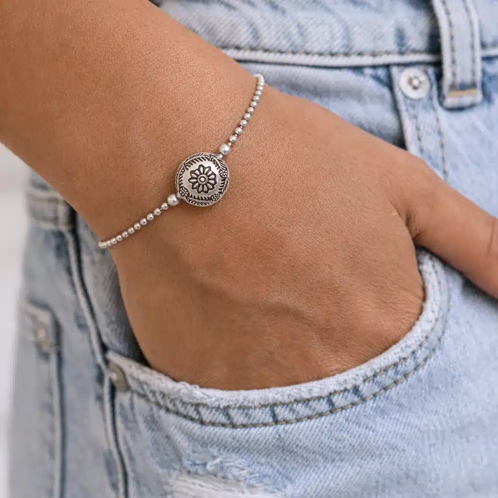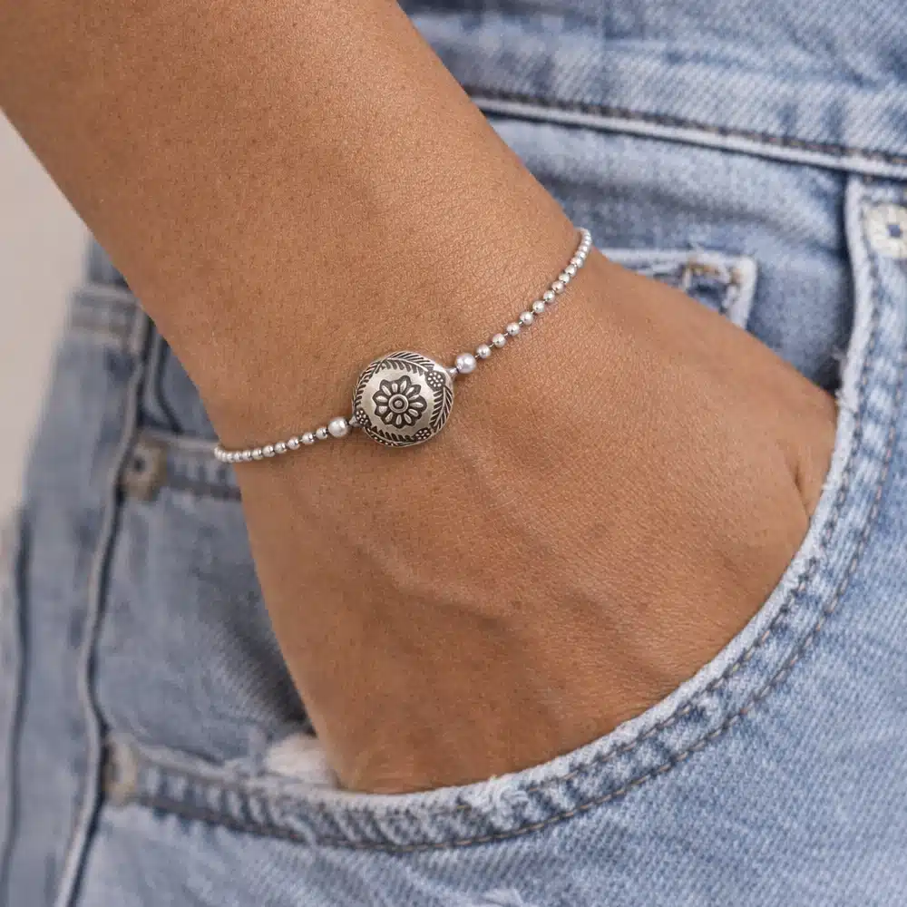 Au centre du bijou se trouve une perle plate en argent, finement travaillée, ornée d’un motif floral en relief. Cette fleur délicatement ciselée apporte une touche poétique et féminine, rappelant l’artisanat traditionnel et le savoir-faire joaillier. Les détails gravés autour de la perle renforcent son caractère authentique et donnent au bracelet un charme intemporel.