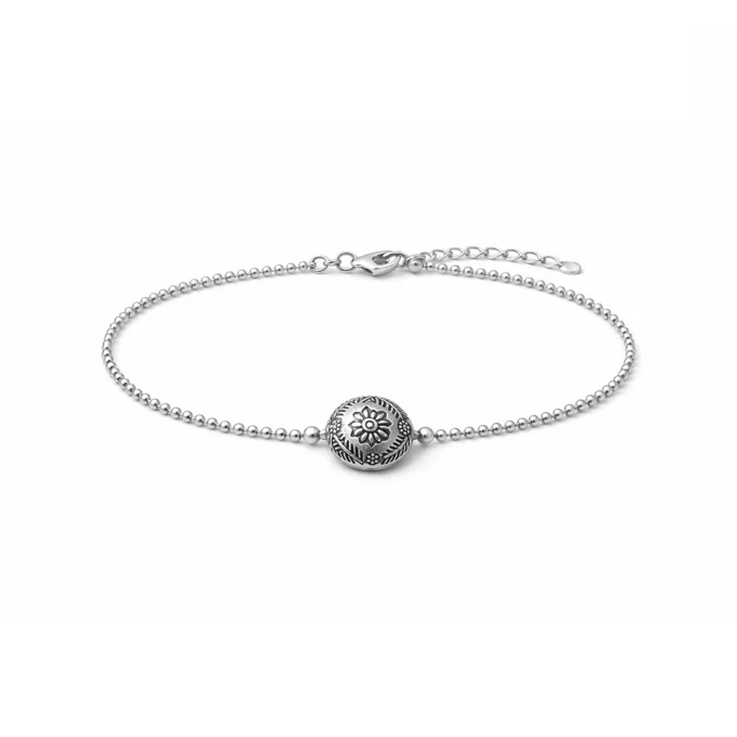 Subtil et lumineux, ce bracelet chaîne en argent 925 est une ode à la féminité et au savoir-faire artisanal. Sa perle plate gravée d’une fleur, associée à une maille boule raffinée, en fait un bijou intemporel qui se porte aussi bien au quotidien que lors de moments précieux.