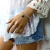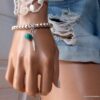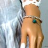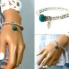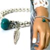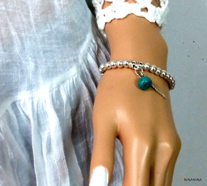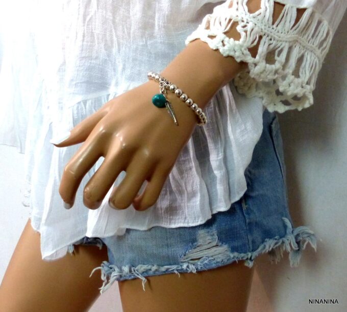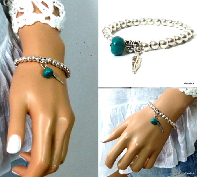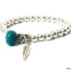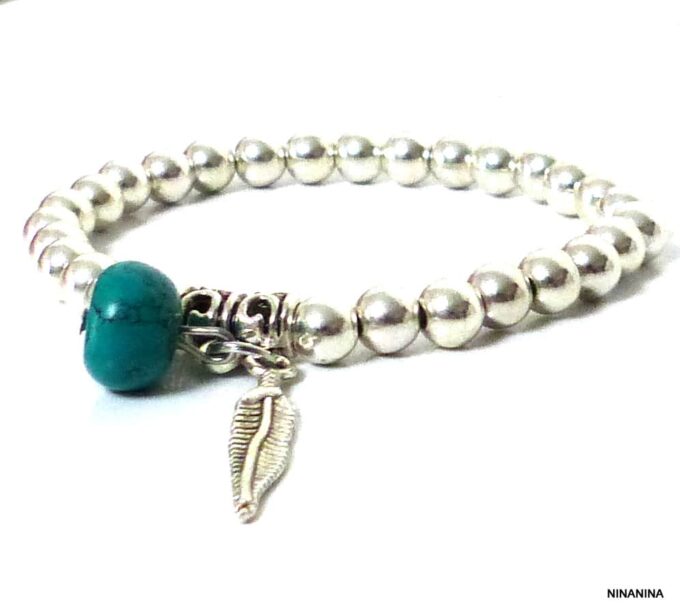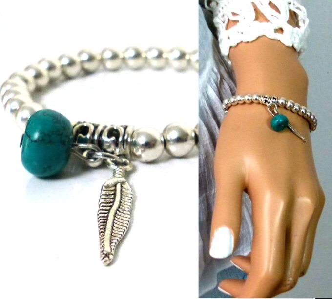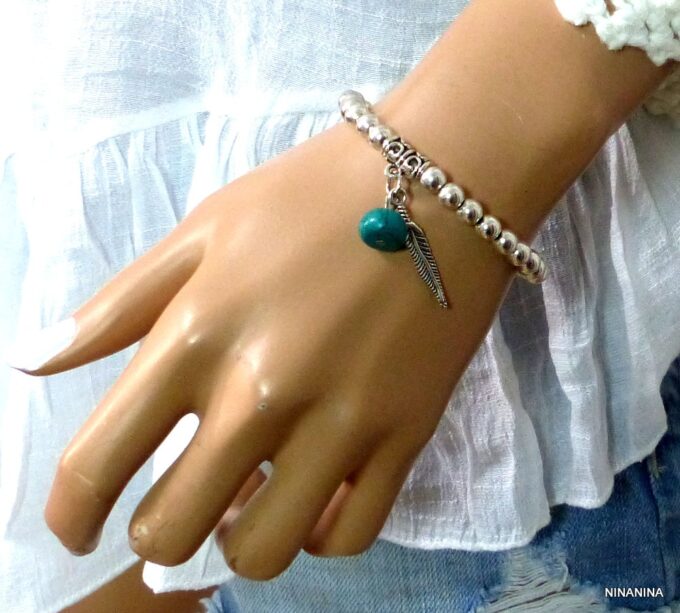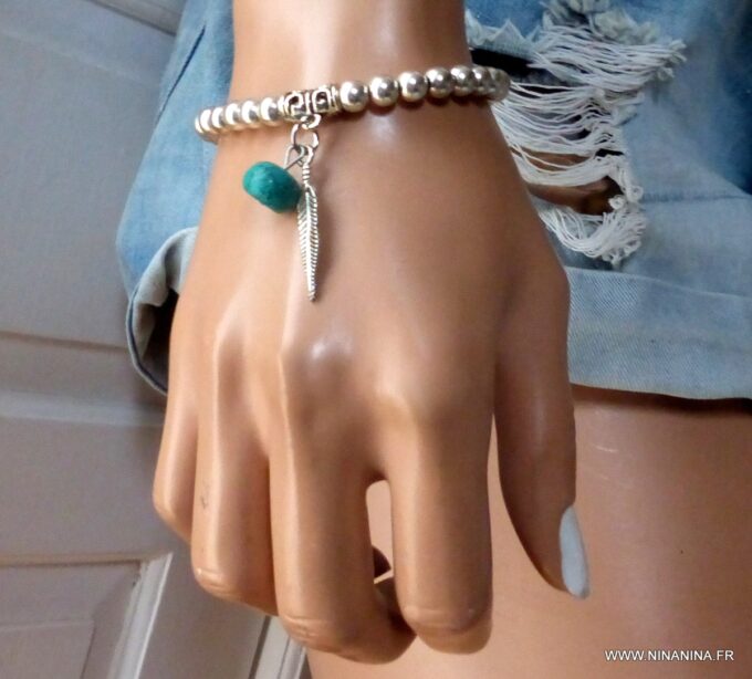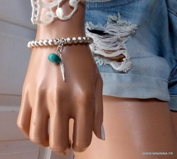 Bracelet plume pas cher perles et turquoise pour femme constitué de perles et plume en métal argenté et d’une turquoise véritable montées sur un elastique double.