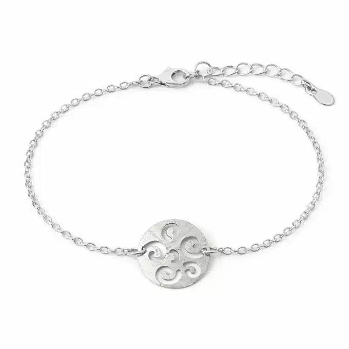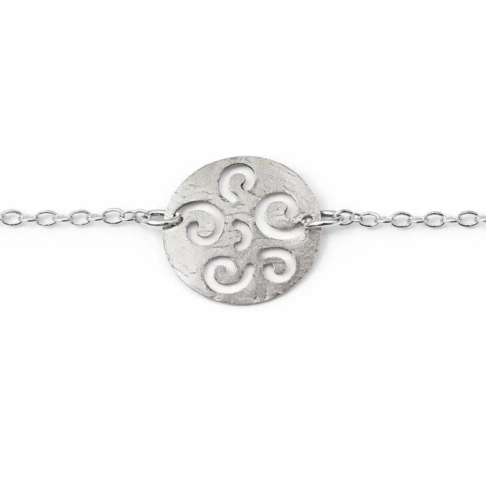 Son élément central est un médaillon rond en argent, subtilement ajouré et décoré d’un motif spirale. Symbole de mouvement, d’harmonie et de continuité, la spirale apporte une dimension à la fois esthétique et symbolique à ce bijou. Le travail ajouré laisse passer la lumière, créant de jolis jeux d’ombres et mettant en valeur l’éclat naturel de l’argent 925.