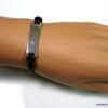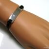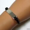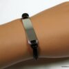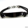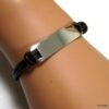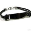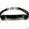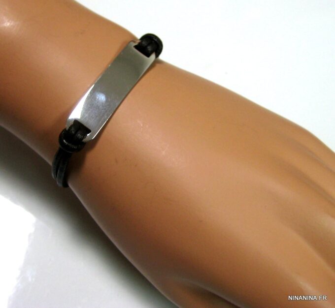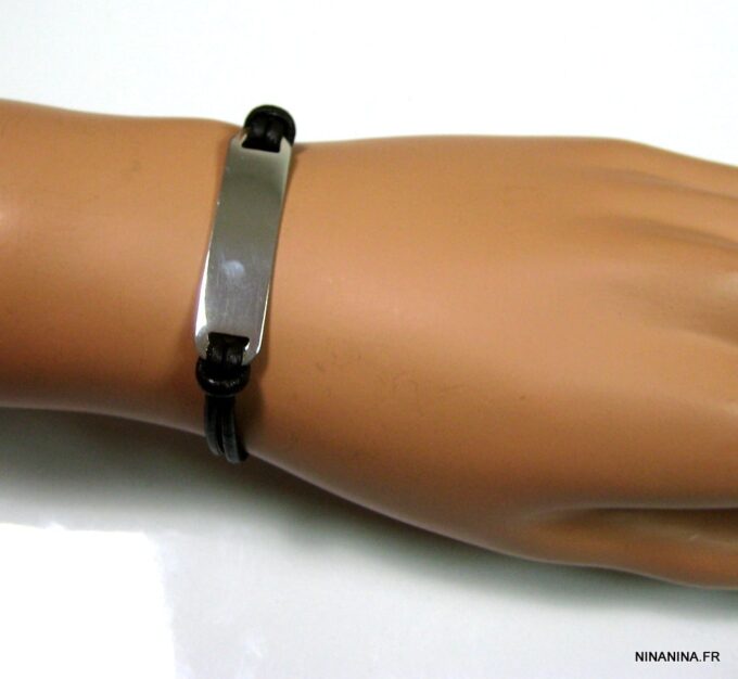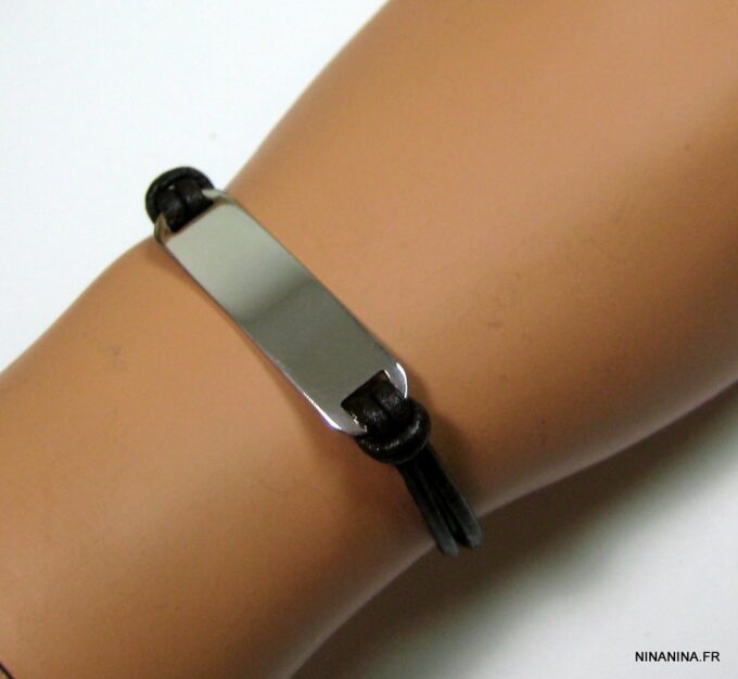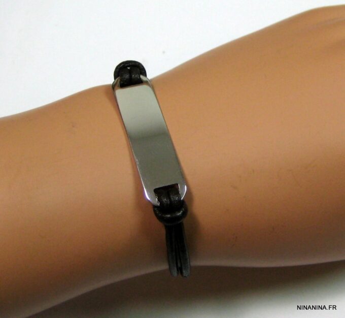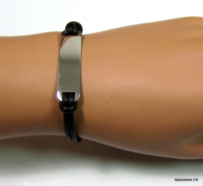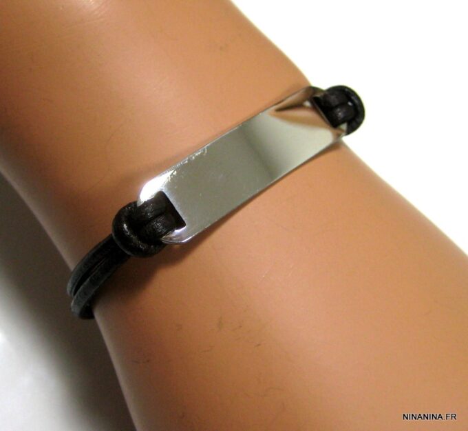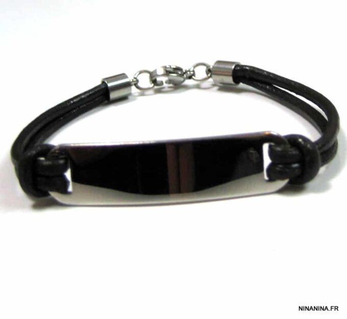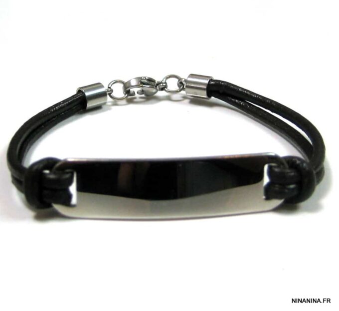 Bracelet cordon cuir acier inoxydable composé d’une plaque gourmette en acier inoxydable montée sur un double cordon de cuir noir (2 mm de diamètre) Dim de la plaque : 4 X 1 cm. Fermoir mousqueton. Longueur : 21 cm (homme) et 19 cm (femme). Livré dans sa pochette d’organza. Bijou 100% fait main