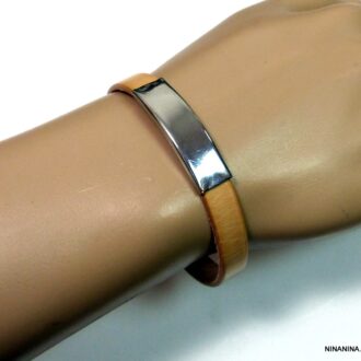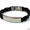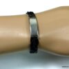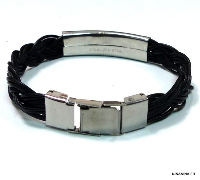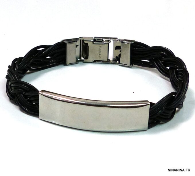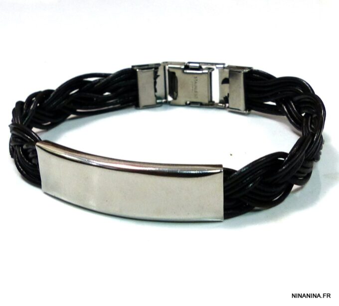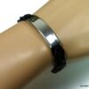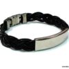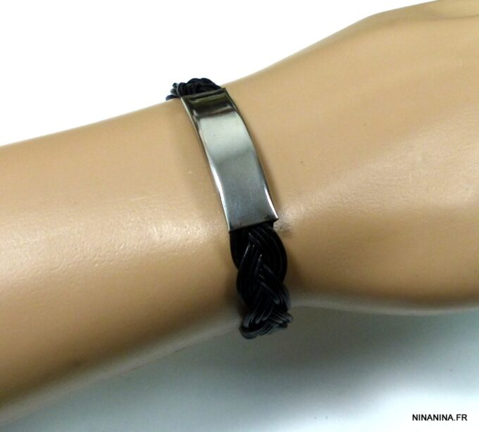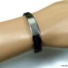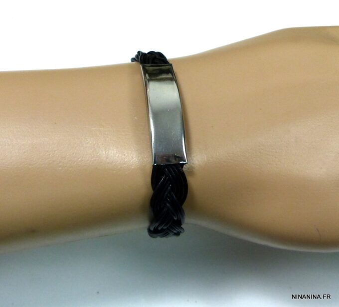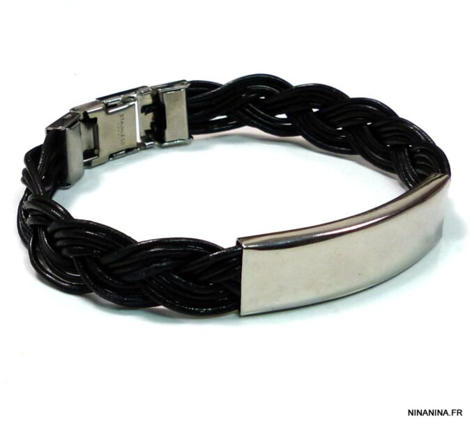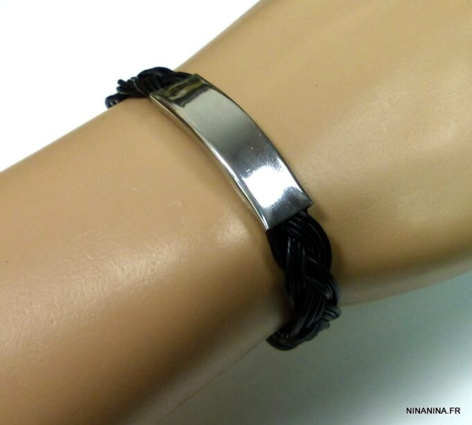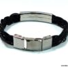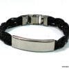 Gourmette Cuir tressé noir et Acier inoxydable composé d’une entretoise rectangulaire en acier inoxydable montée sur un bandeau de cuir noir tressé (10 mm de large).