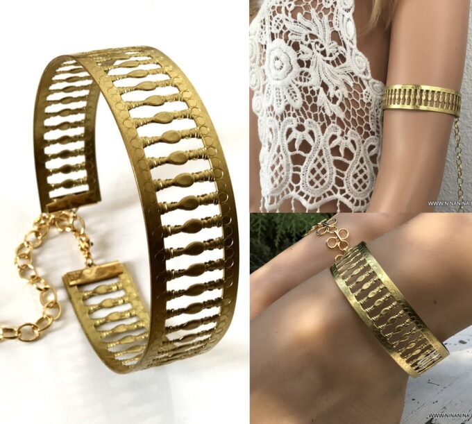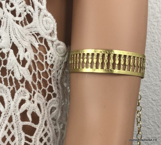 Vous allez craquer pour ce Bracelet haut de bras doré – brassard femme large en laiton et ses motifs délicats découpés dans du laiton doré. Il terminé par un fermoir mousqueton, sûr et facile d’utilisation et d’une chainette de réglage.