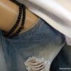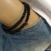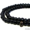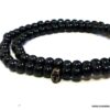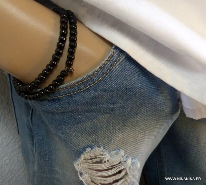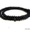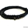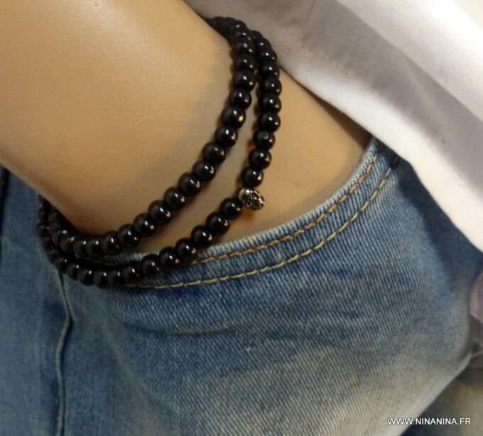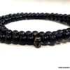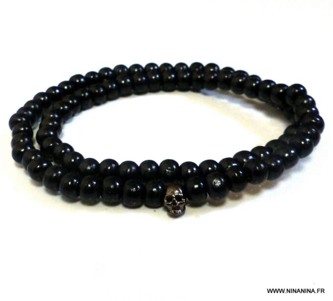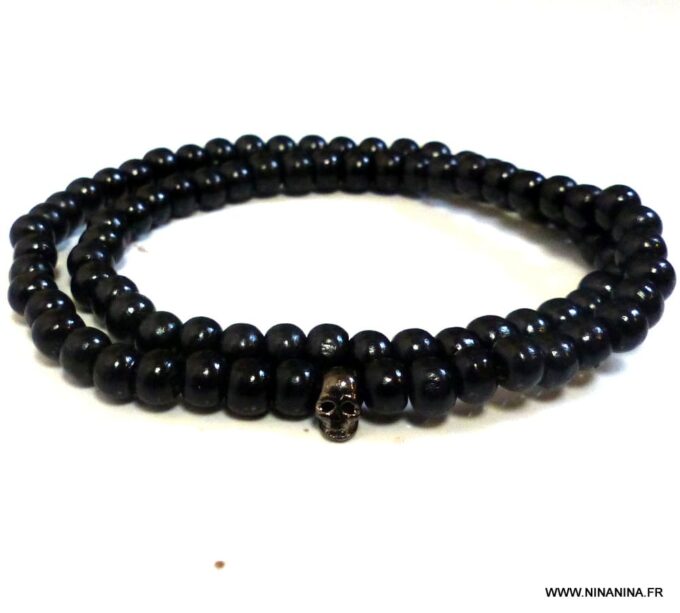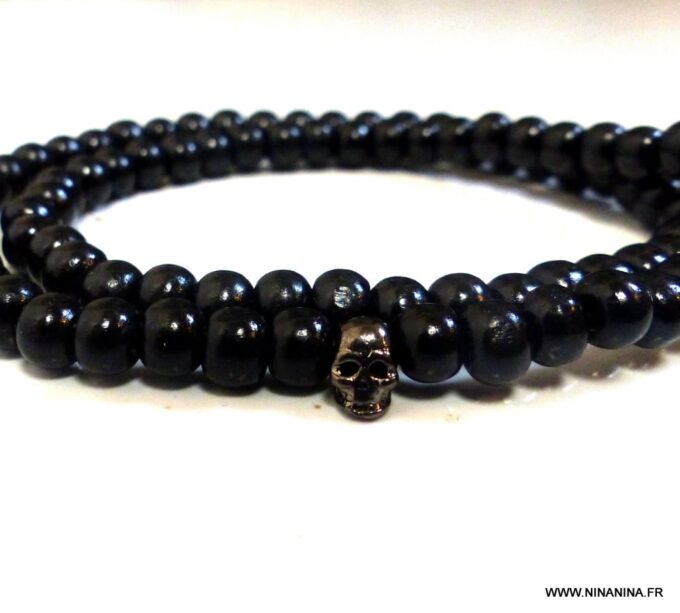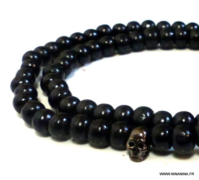 Bracelet double tours perle noir et tete de mort composé d’une perle tête de mort en métal noir et de perles en bois noires rondes montées sur un lien elastique.