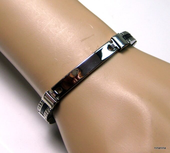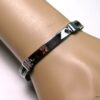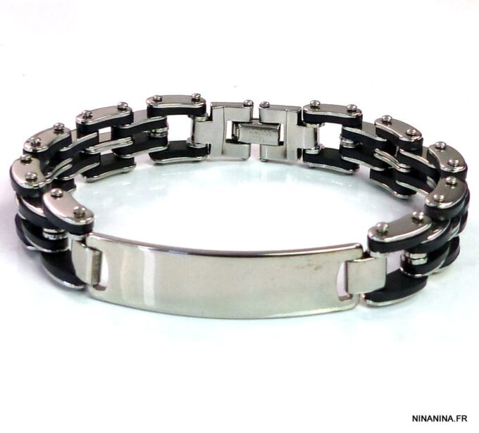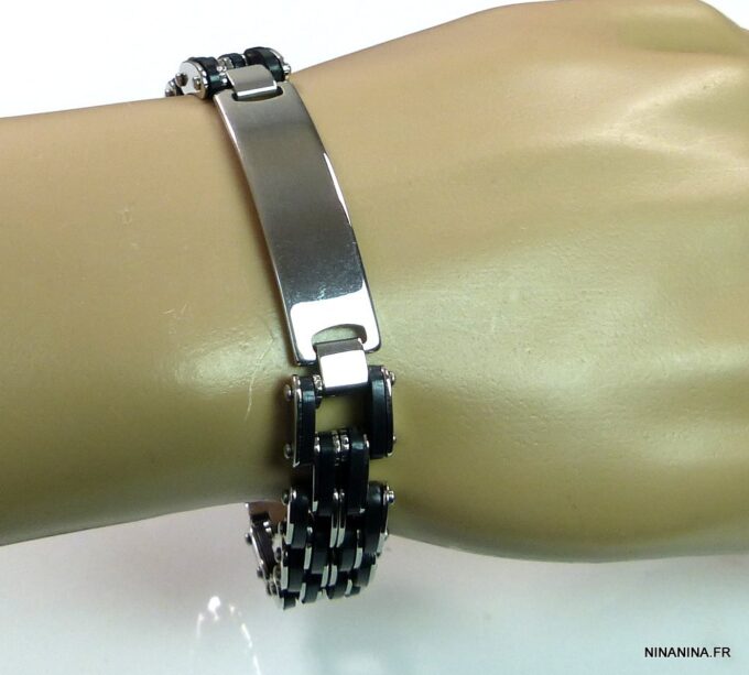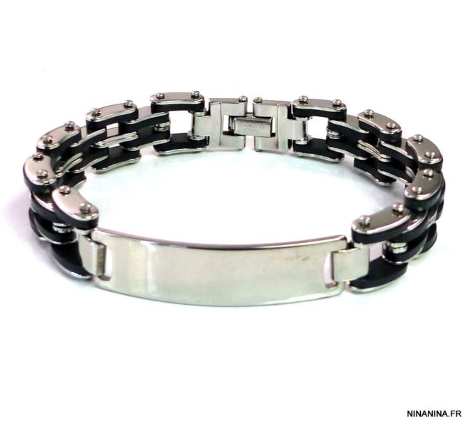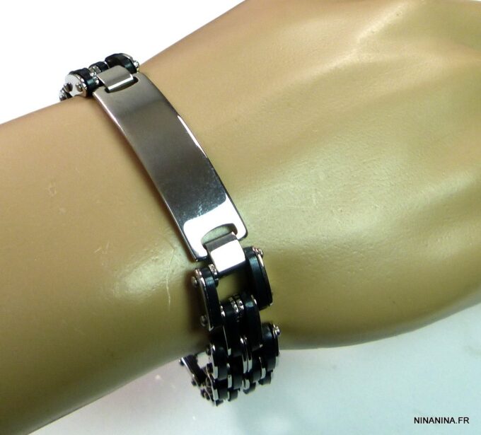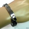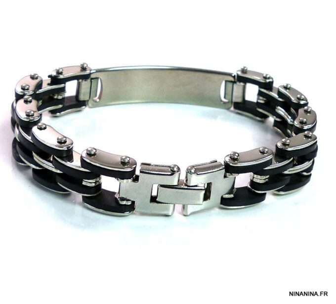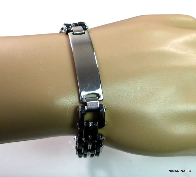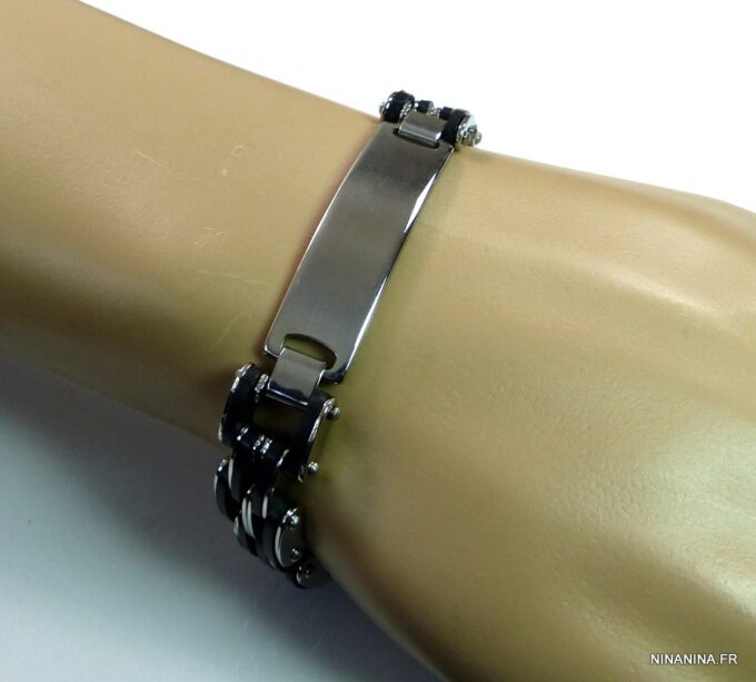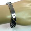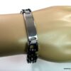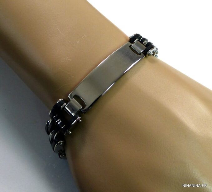 Gourmette Acier inoxydable argent homme et cuir noir. Largeur : 0,8 cm. Longueur : 20,5 cm env. Taille unique. Livré dans sa pochette d’organza.