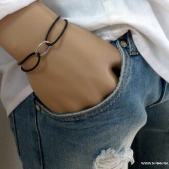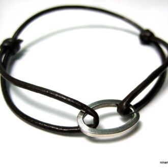 Bracelet homme cordon cuir anneau plaqué argent composé d’un anneau ovale en plaqué argent monté sur un cordon de cuir noir (2 mm de diamètre).