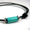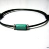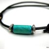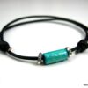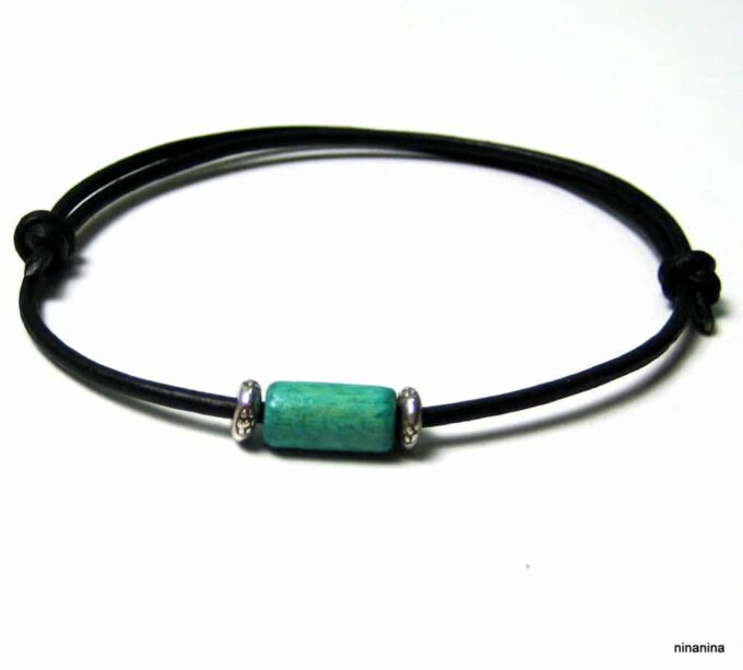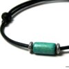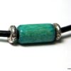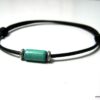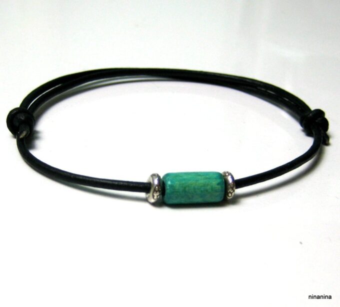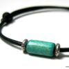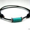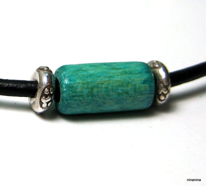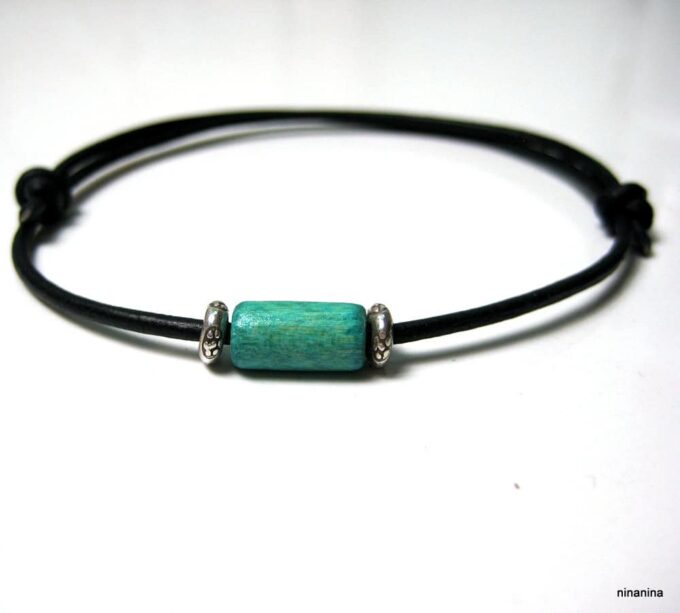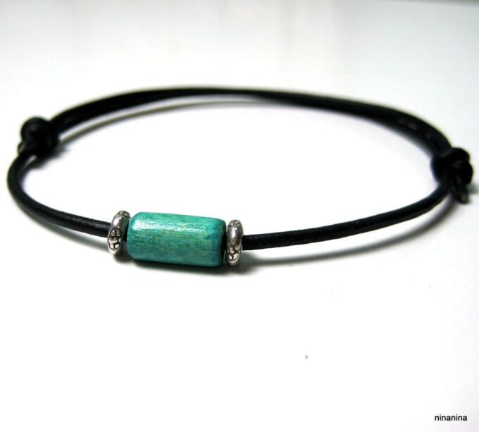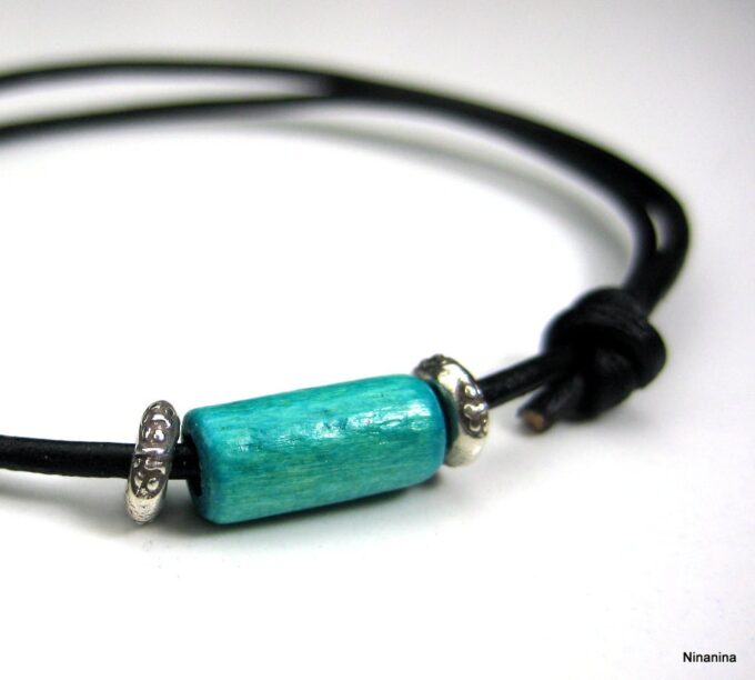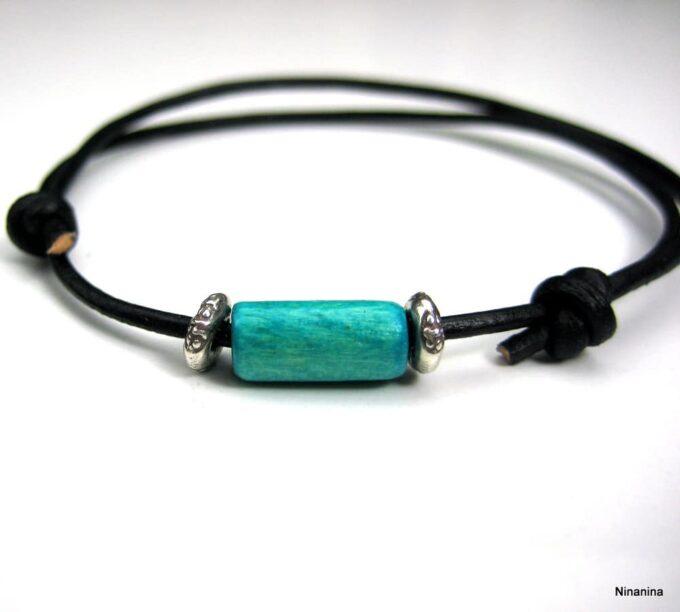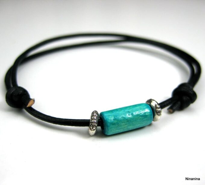Bracelet homme argent massif bois et cuir composé d’une perle en bois turquoise et de 2 rondelles en argent 925 montées sur un cordon en cuir noir (2 mm de diamètre).