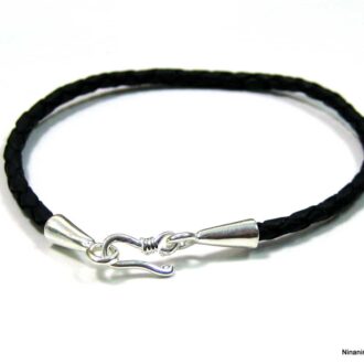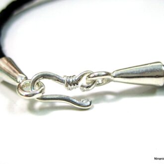 Bracelet homme cordon cuir crochet argent massif composé d’un fermoir crochet en argent 925 monté sur un cordon en cuir noir (2 mm de diamètre).