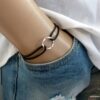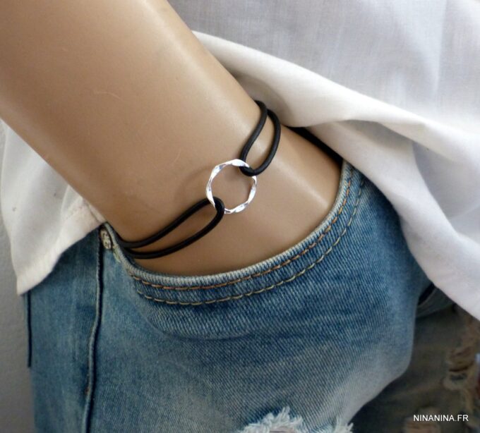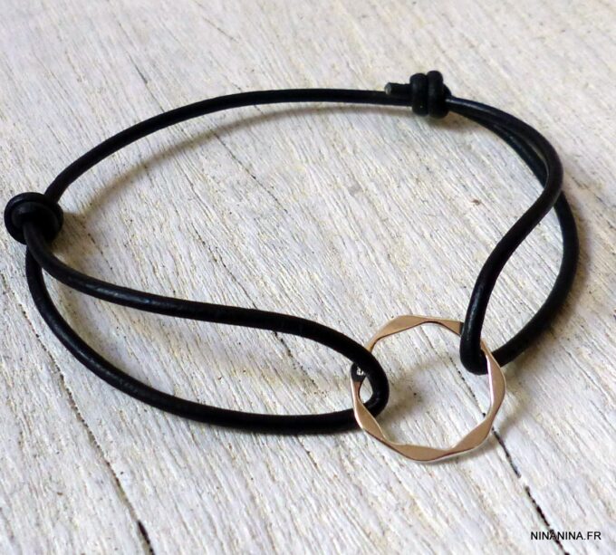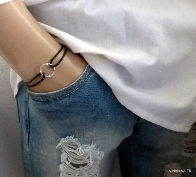 Bracelet cordon cuir réglable anneau Argent 925 massif composé d’un anneau rond en argent 925 monté sur un cordon en cuir véritable (2mm d’epaisseur).