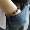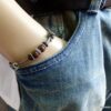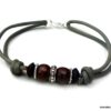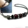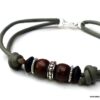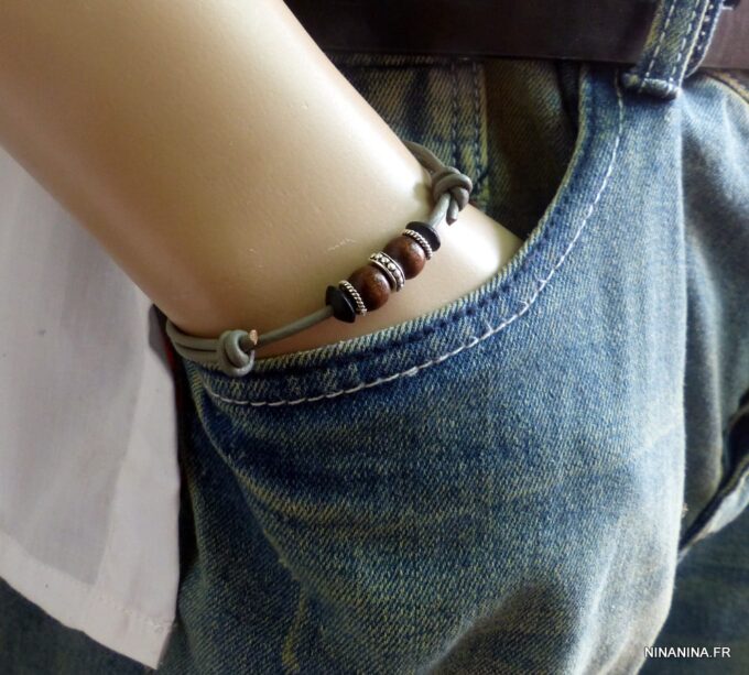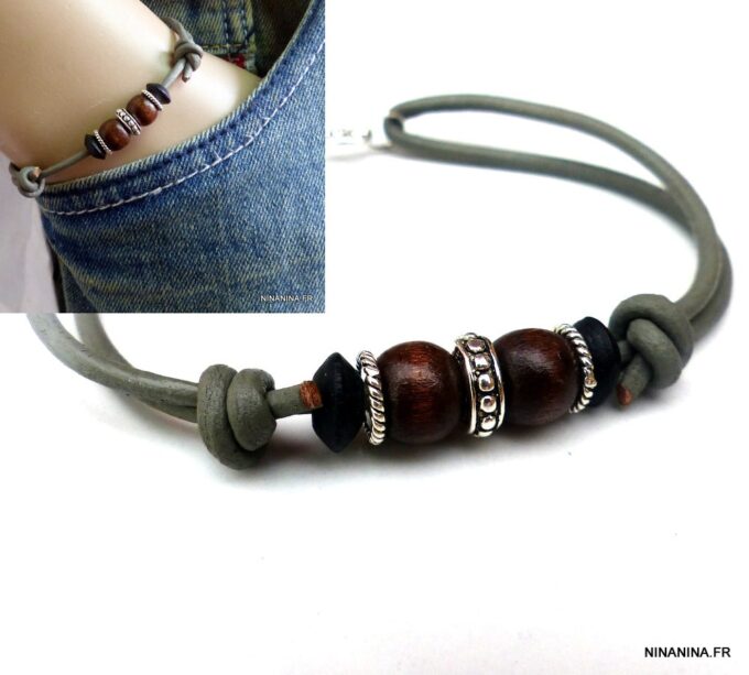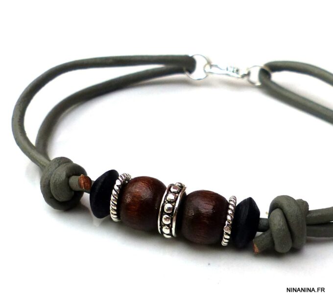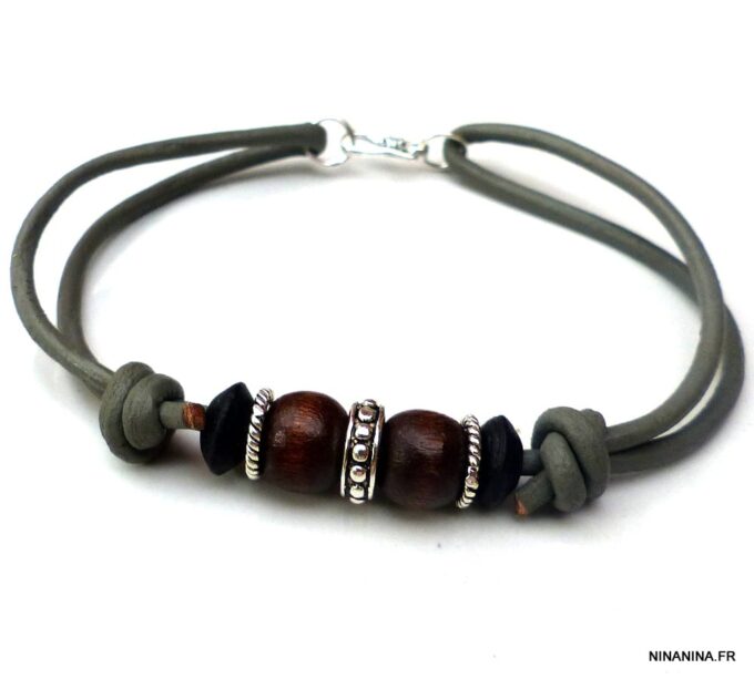 Bracelet homme cordon cuir gris perles Argent et bois composé de perles de bois marron et noires et de rondelles en argent 925 montées sur un cordon de cuir gris clair.