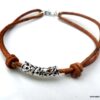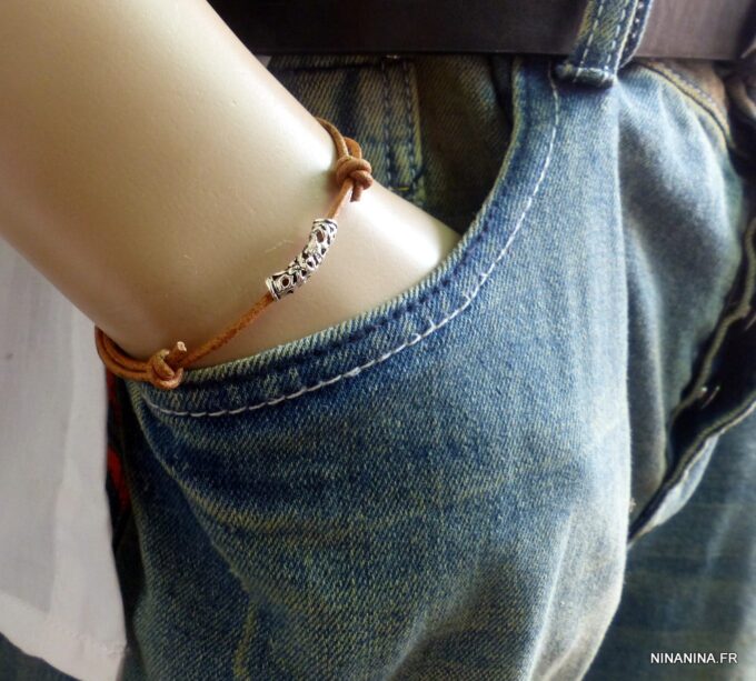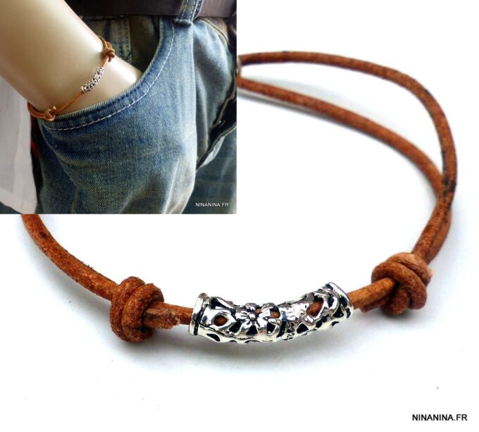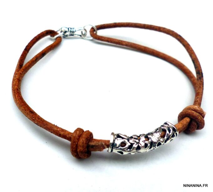 Bracelet homme cordon cuir réglable perle Argent composé d’une perle tube filigranée en argent 925 montée sur un cordon de cuir naturel.