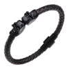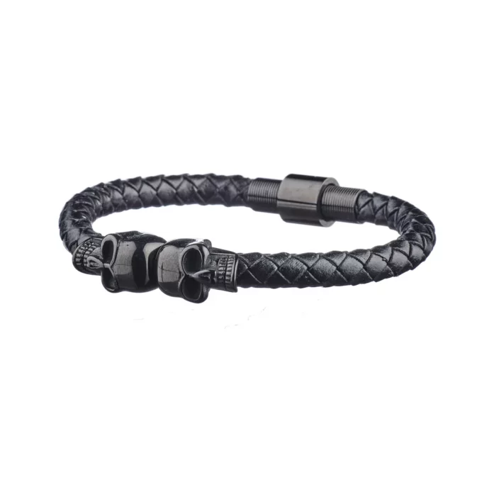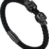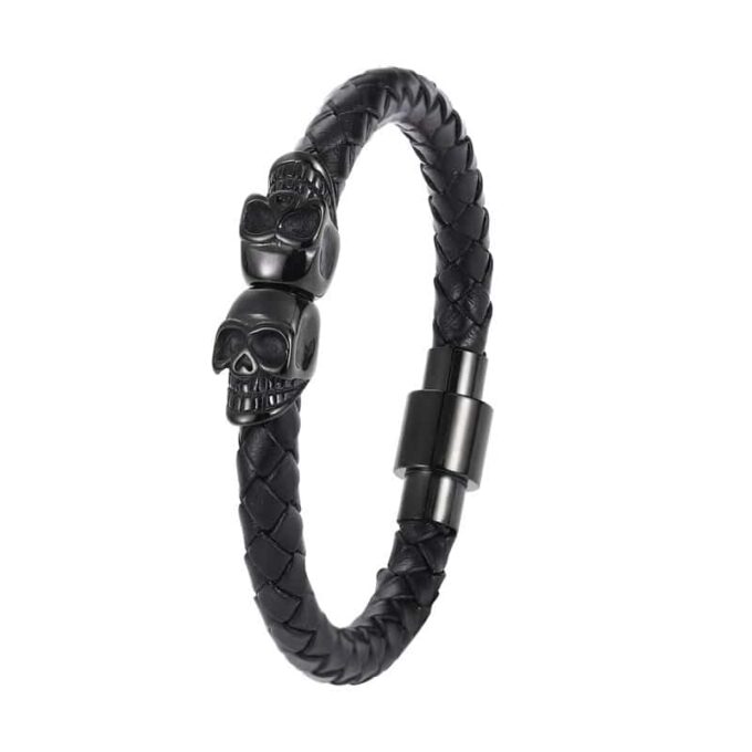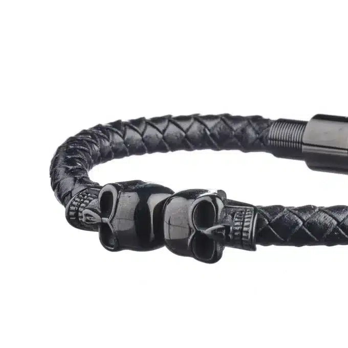 Apportez une touche rock n’roll à votre look avec ce magnifique Bracelet cuir tete de mort double acer inoxydable noir ! Composé de deux perles en forme de crâne en acier inoxydable noir et d’un fermoir contemporain aimanté en Acier noir monté sur un cordon de cuir tressé noir de 5 mm de diamètre, il est fait pour vous!